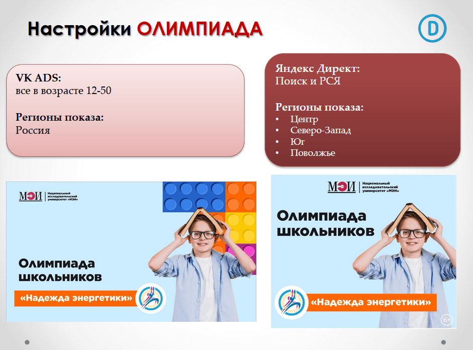 Перед запуском рекламной кампании был проведён детальный анализ аудитории. Определены две основные группы: старшеклассники и их родители.В кампании использовались разные креативы в фирменном стиле Института. По итогам тестов были выявлены наиболее эффективные варианты.Результаты показали, что наибольший отклик обеспечил таргетинг на родителе