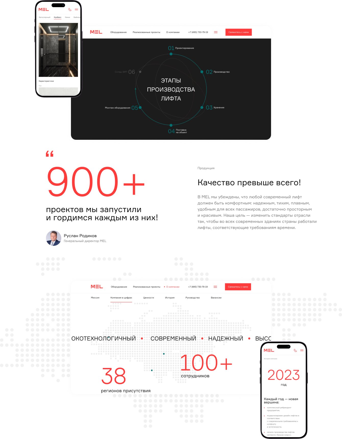 Так же с помощью анимации скролла мы подчеркнули этапы производства лифта. А интерактивная карта регионов присутствия в полной мере показывает объем производства.