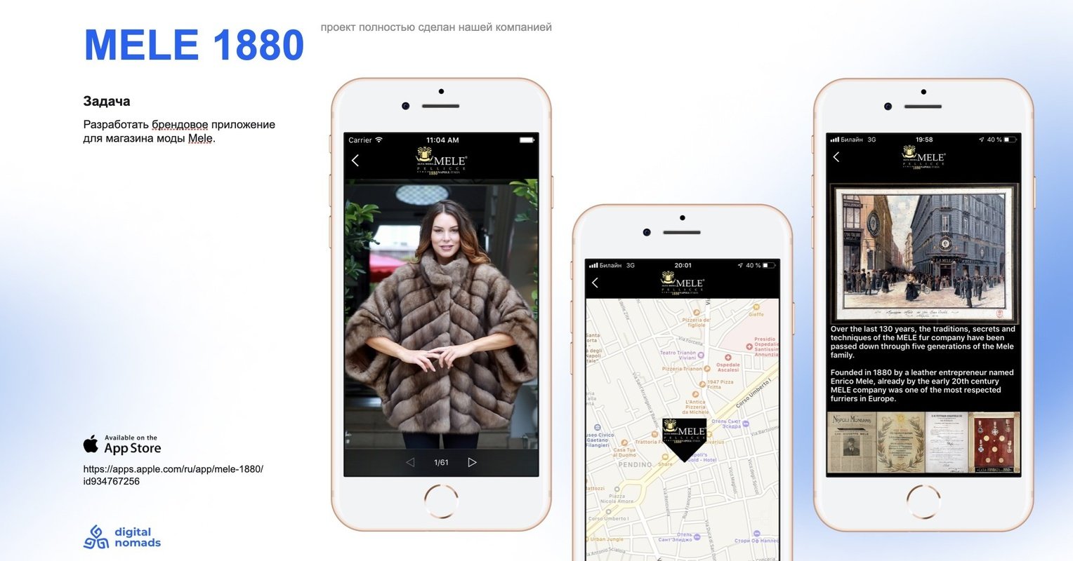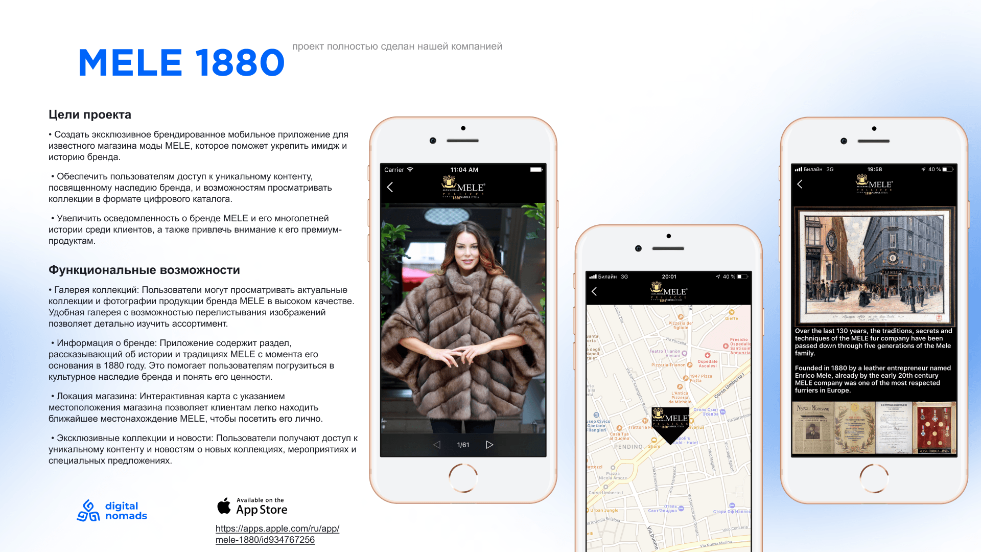• Создать эксклюзивное брендированное мобильное приложение для известного магазина моды MELE, которое поможет укрепить имидж и историю бренда.