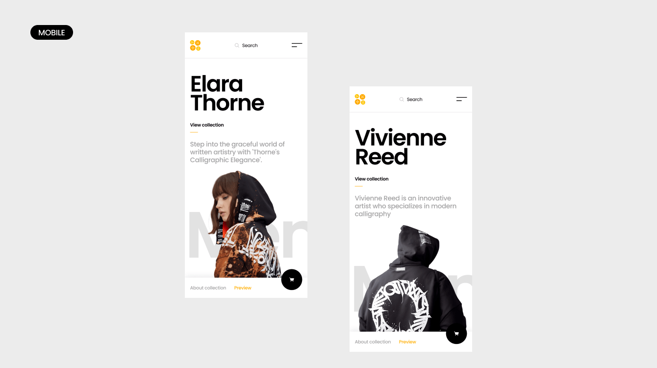Типографика: Были выбраны шрифты, подчеркивающие индивидуальность брендов и артистов, представленных на платформе. Это дало возможность визуально выделить ключевые элементы сайта и обеспечить читаемость контента.