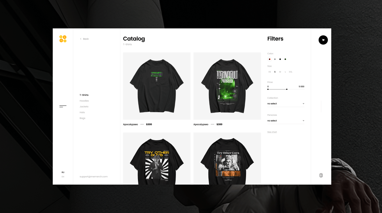 На начальном этапе мы провели анализ целевой аудитории и рынка мерча, изучив требования и предпочтения пользователей. Это позволило нам заложить основу для создания простого и удобного интерфейса.