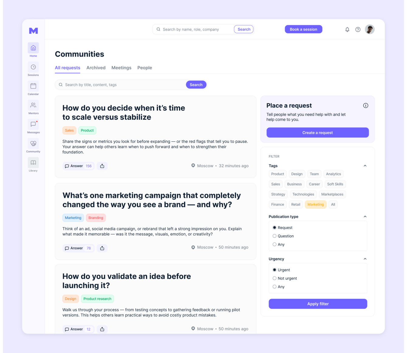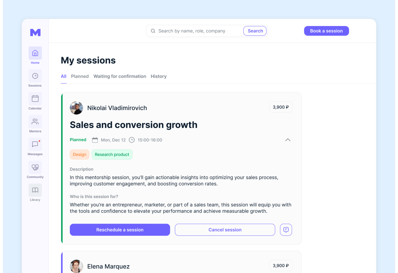Интеллектуальная система поиска и бронирования: Менти могут быстро найти подходящего ментора по фильтрам и забронировать сессию в несколько клиентов, получив сразу всю информацию об эксперте и его опыте.