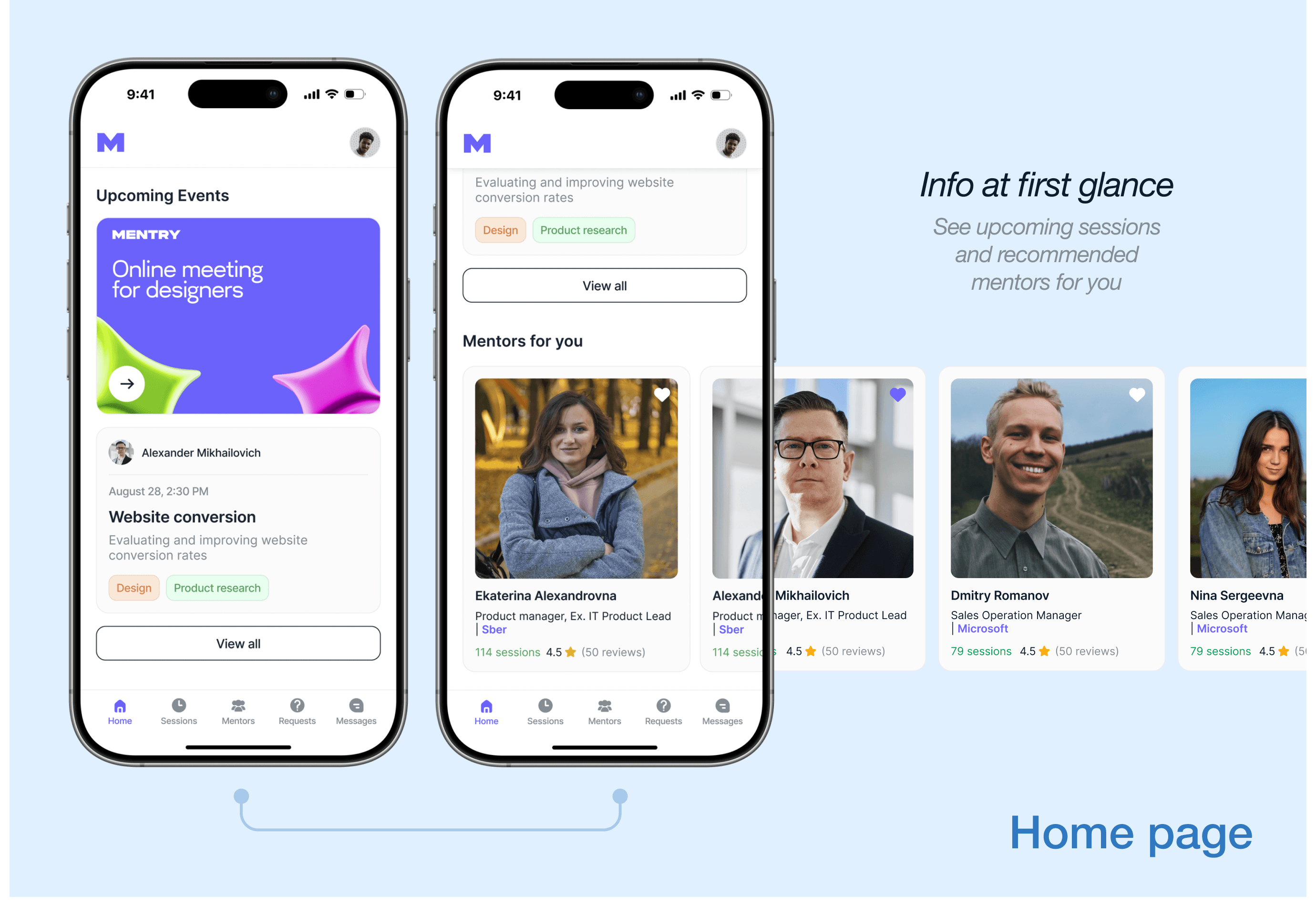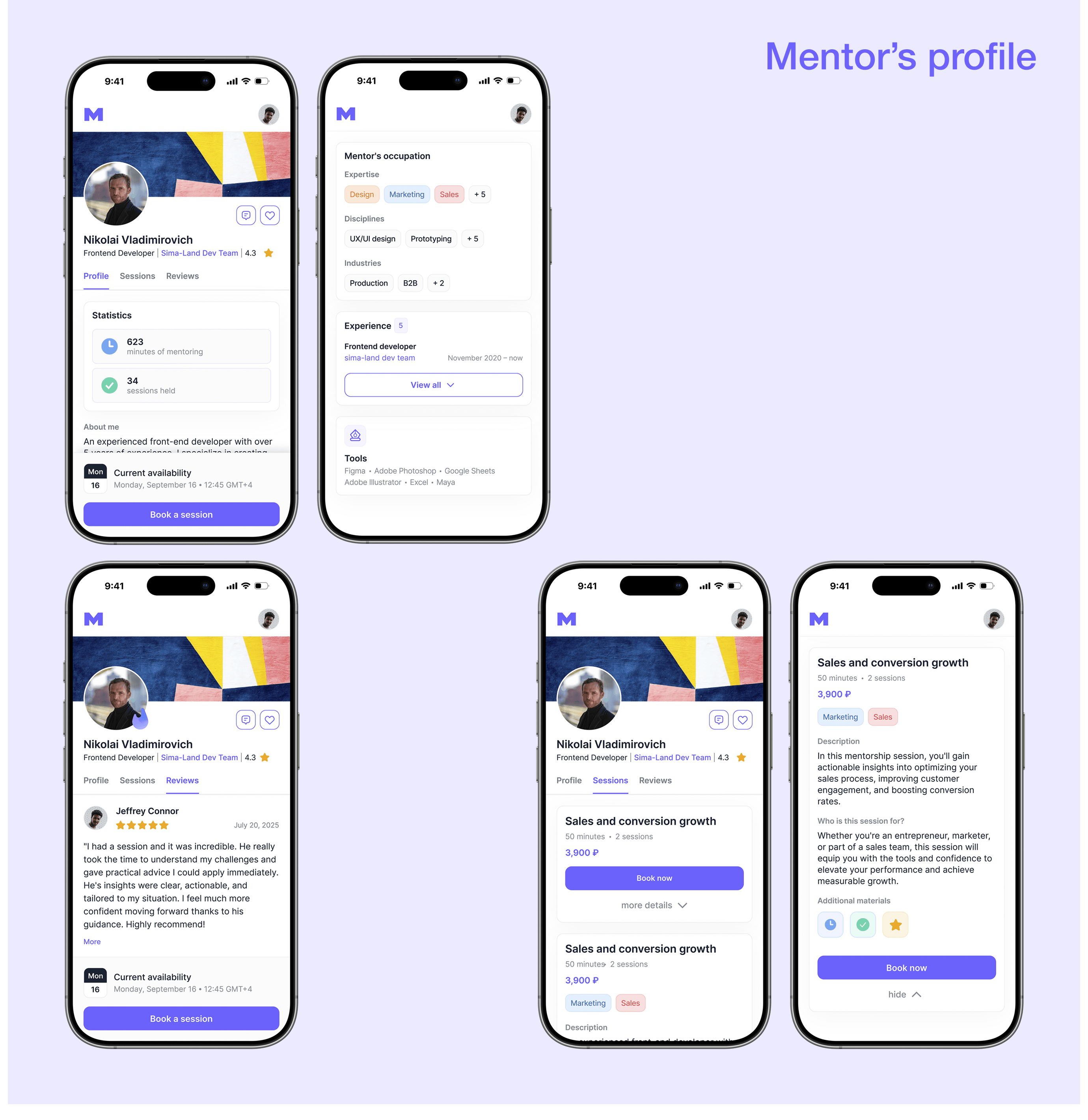 - Создание ключевых экранов: Визуальное оформление главной страницы, личных кабинетов ментора и менти