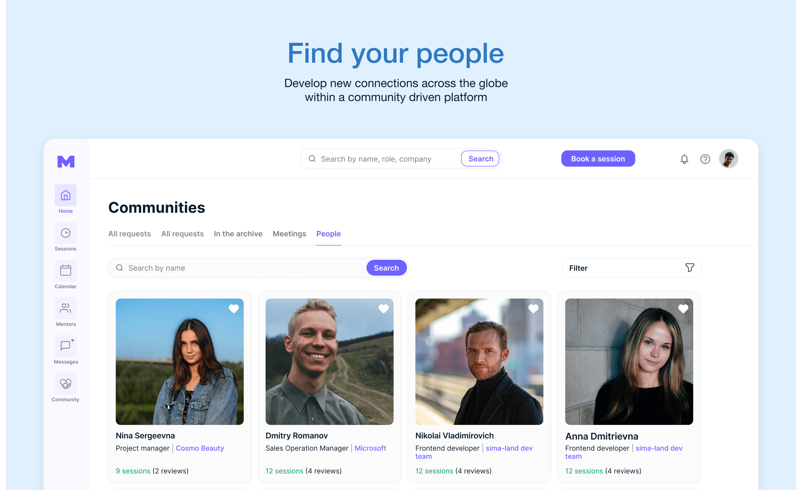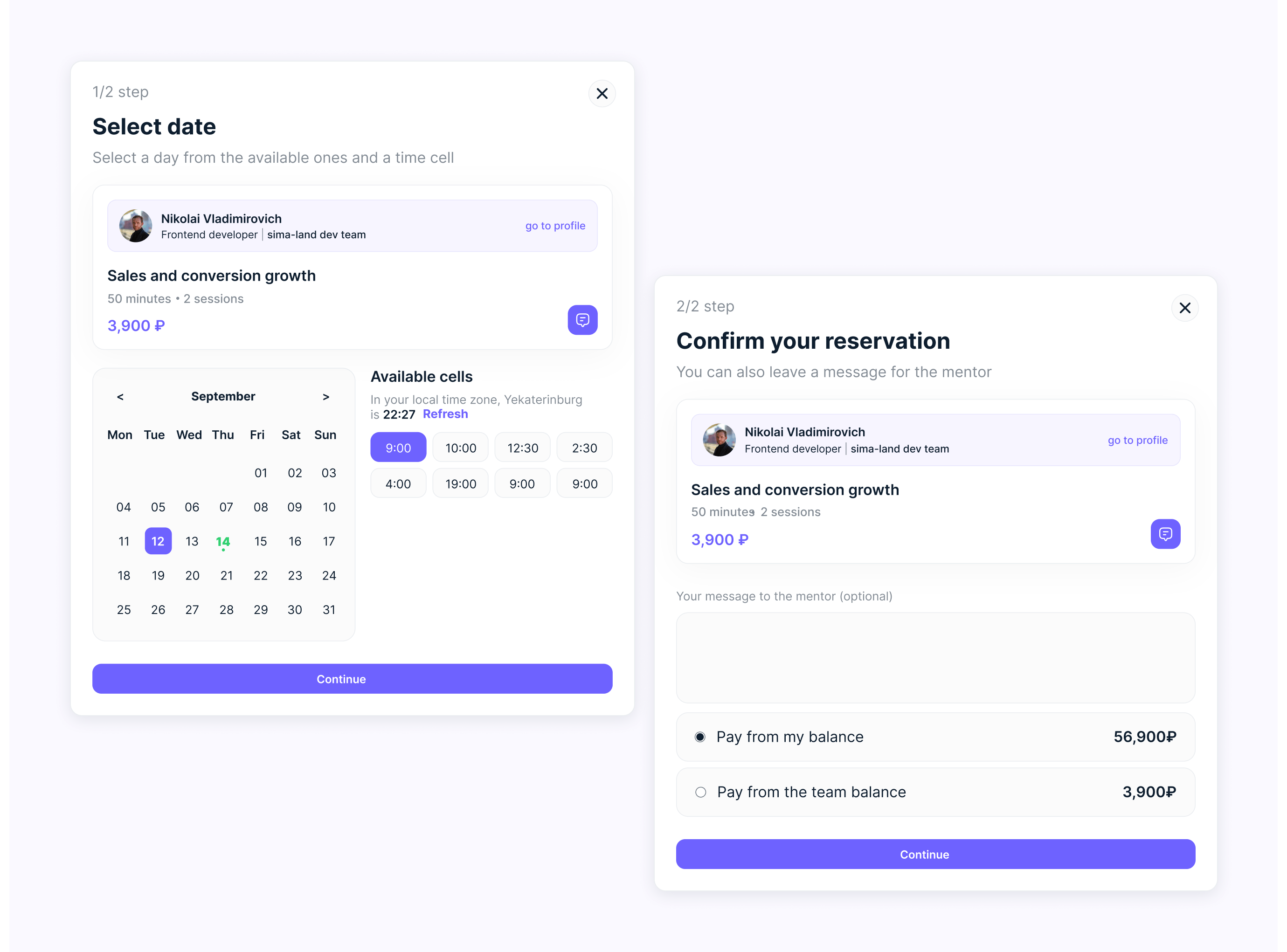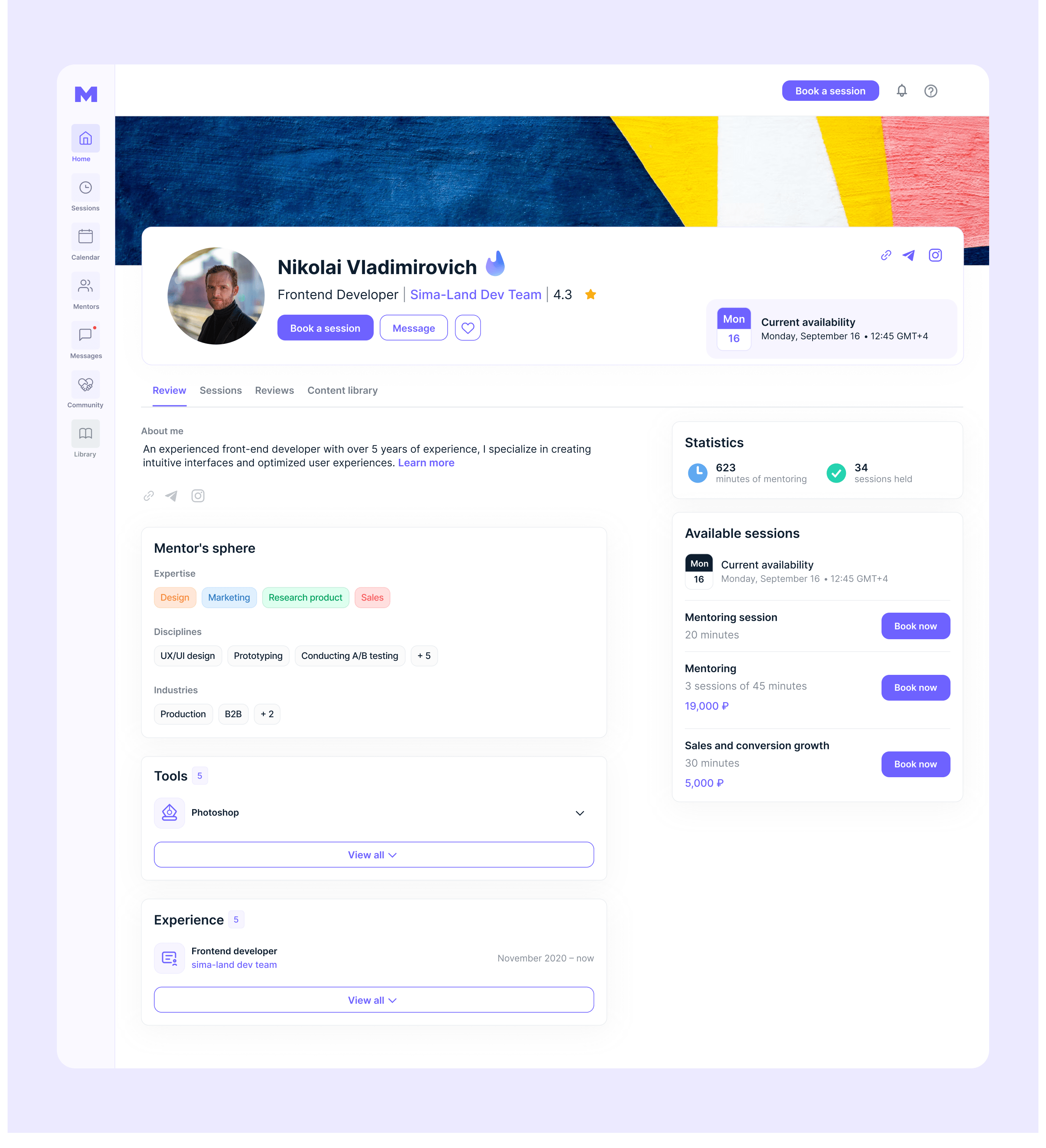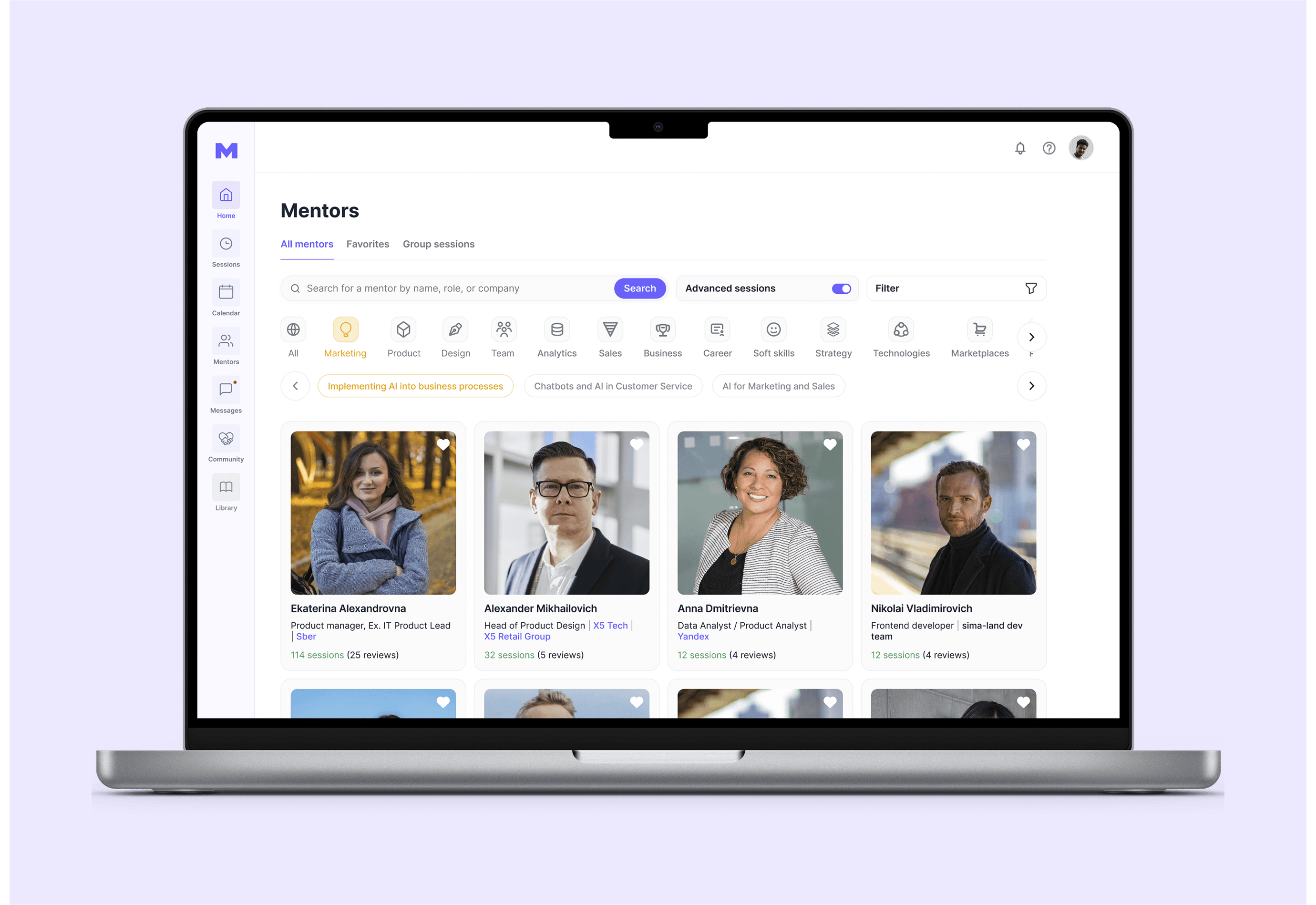 Интеллектуальная система поиска и бронирования: Менти могут быстро найти подходящего ментора по фильтрам и забронировать сессию в несколько клиентов, получив сразу всю информацию об эксперте и его опыте.