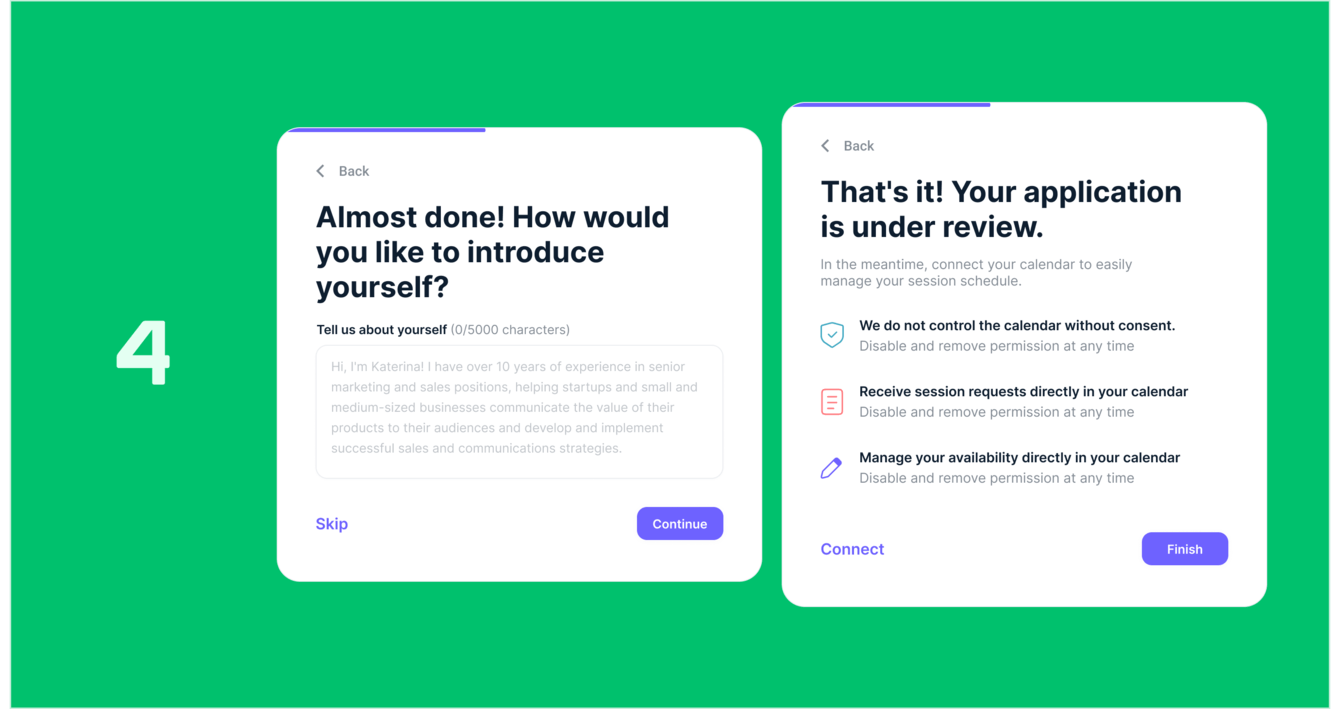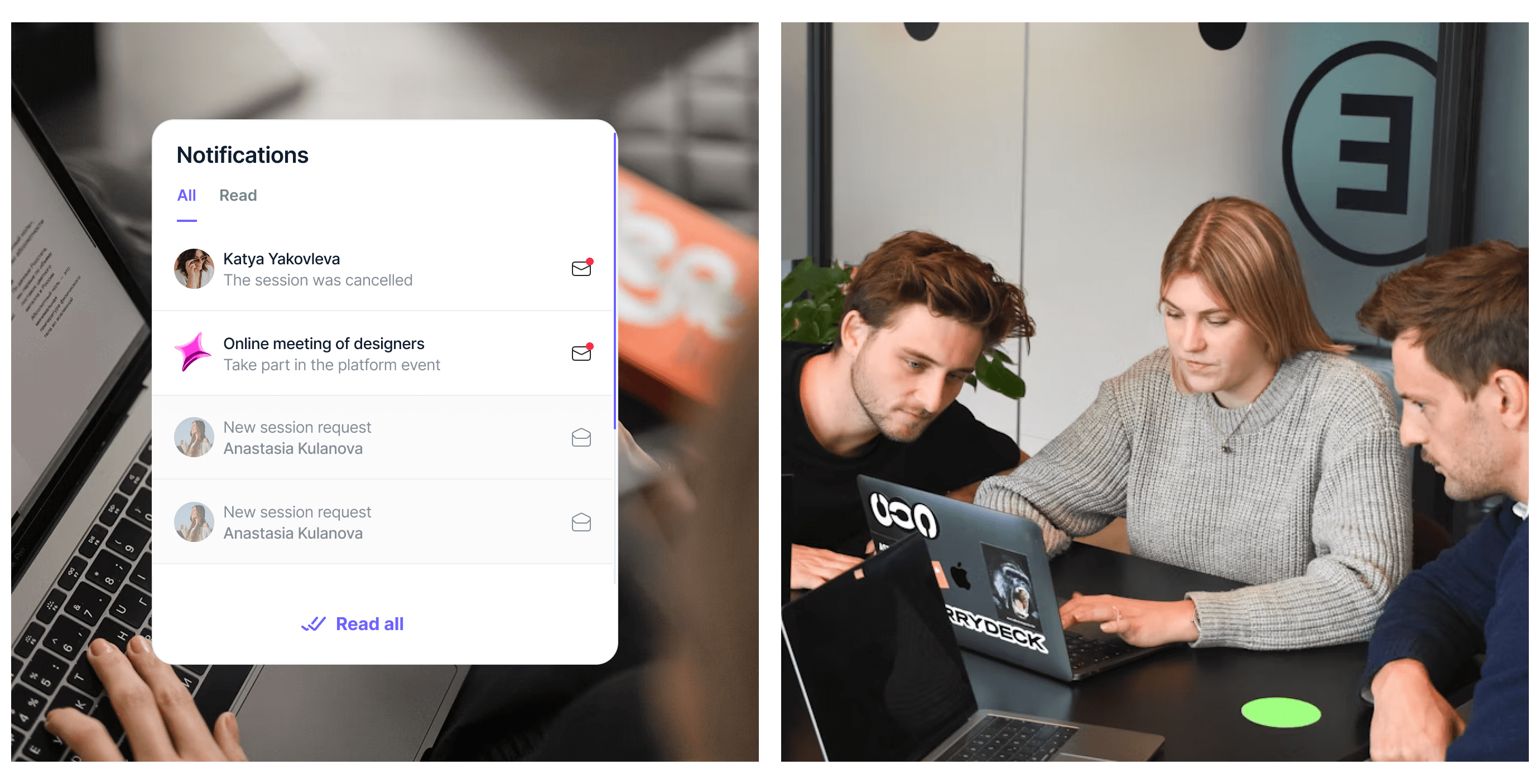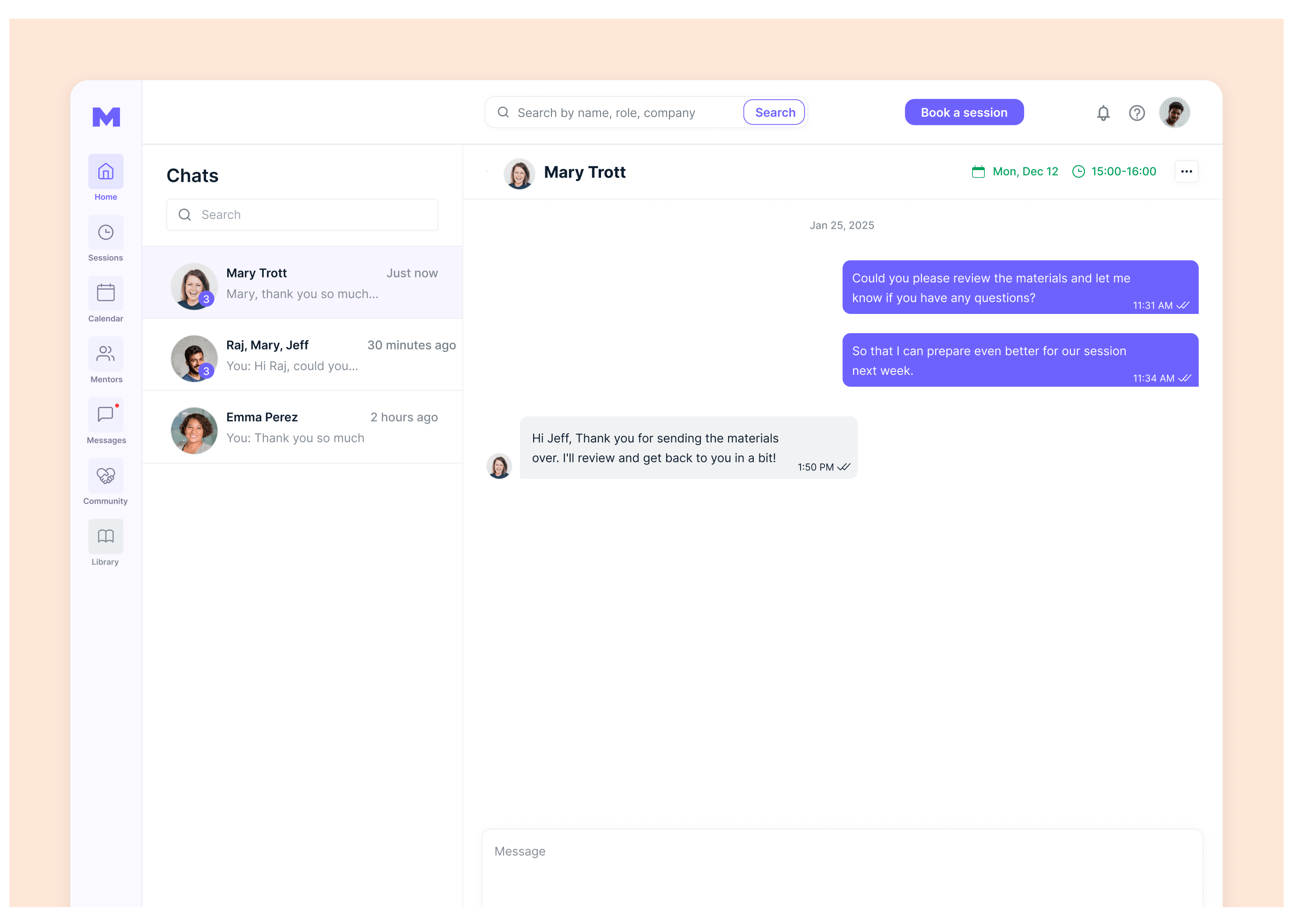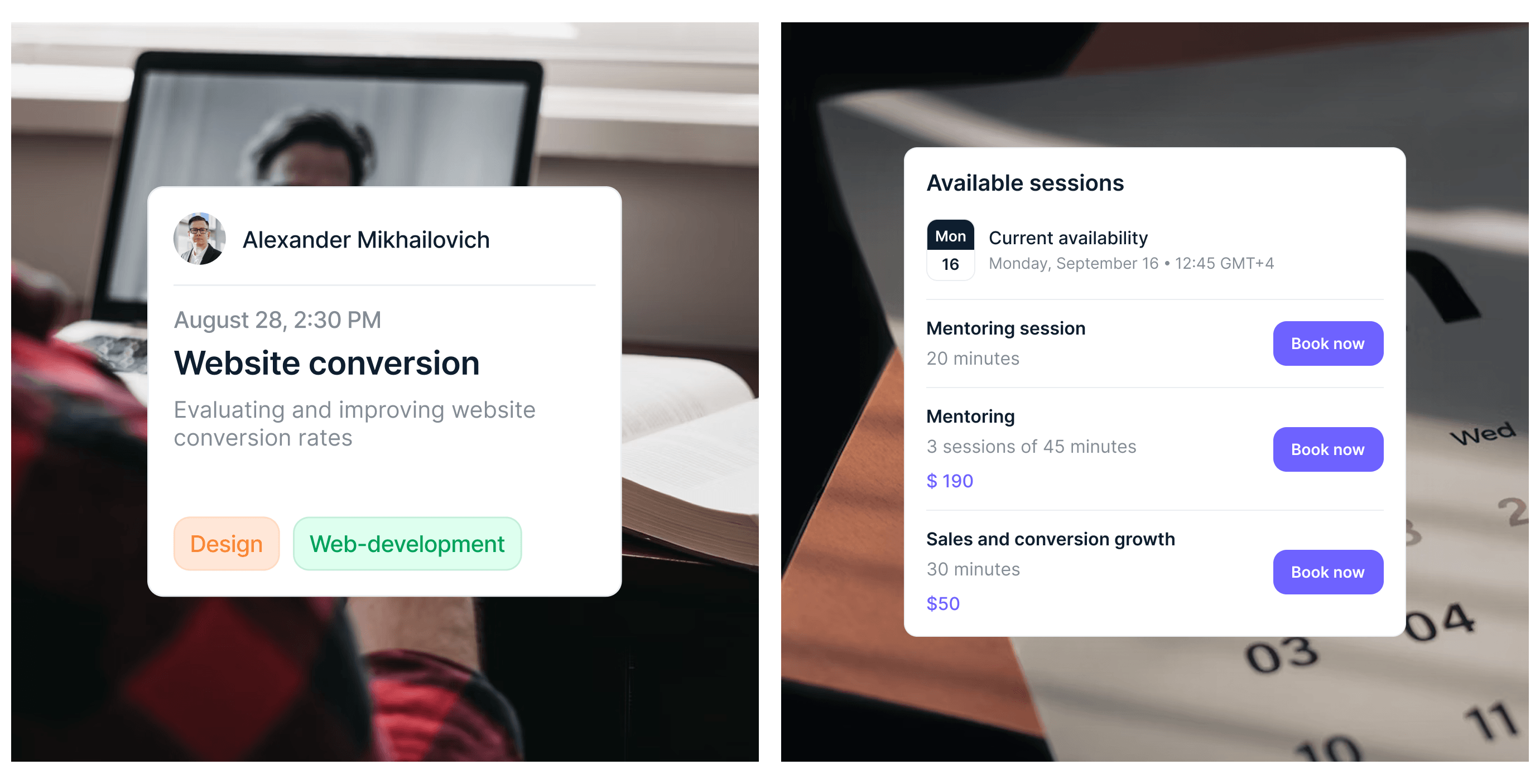 Интеллектуальная система поиска и бронирования: Менти могут быстро найти подходящего ментора по фильтрам и забронировать сессию в несколько клиентов, получив сразу всю информацию об эксперте и его опыте.