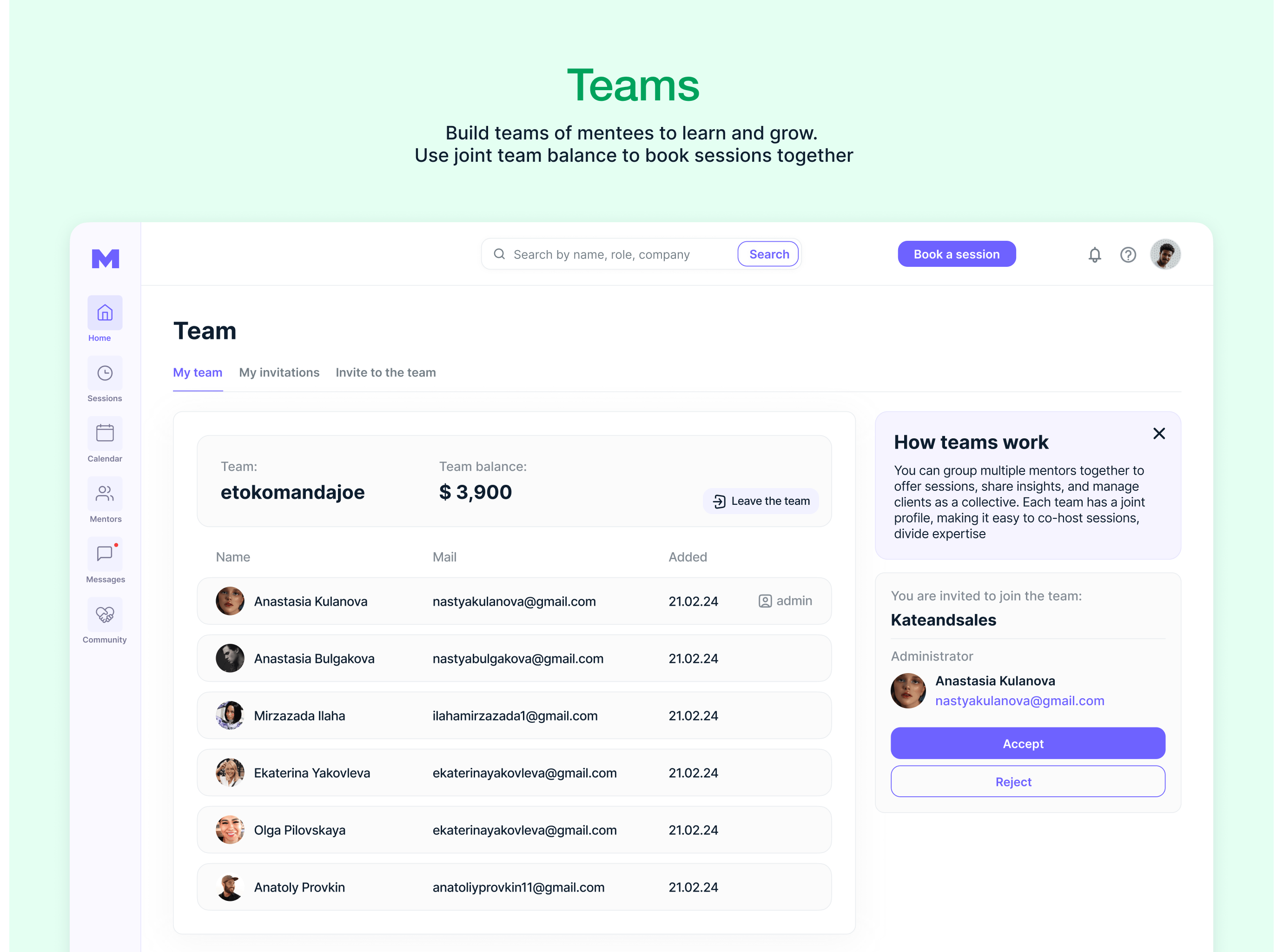 - Функционал команд, позволяющий группе менти объединяться и использовать общий баланс для совместных сессий, что открывает новые бизнес-модели.