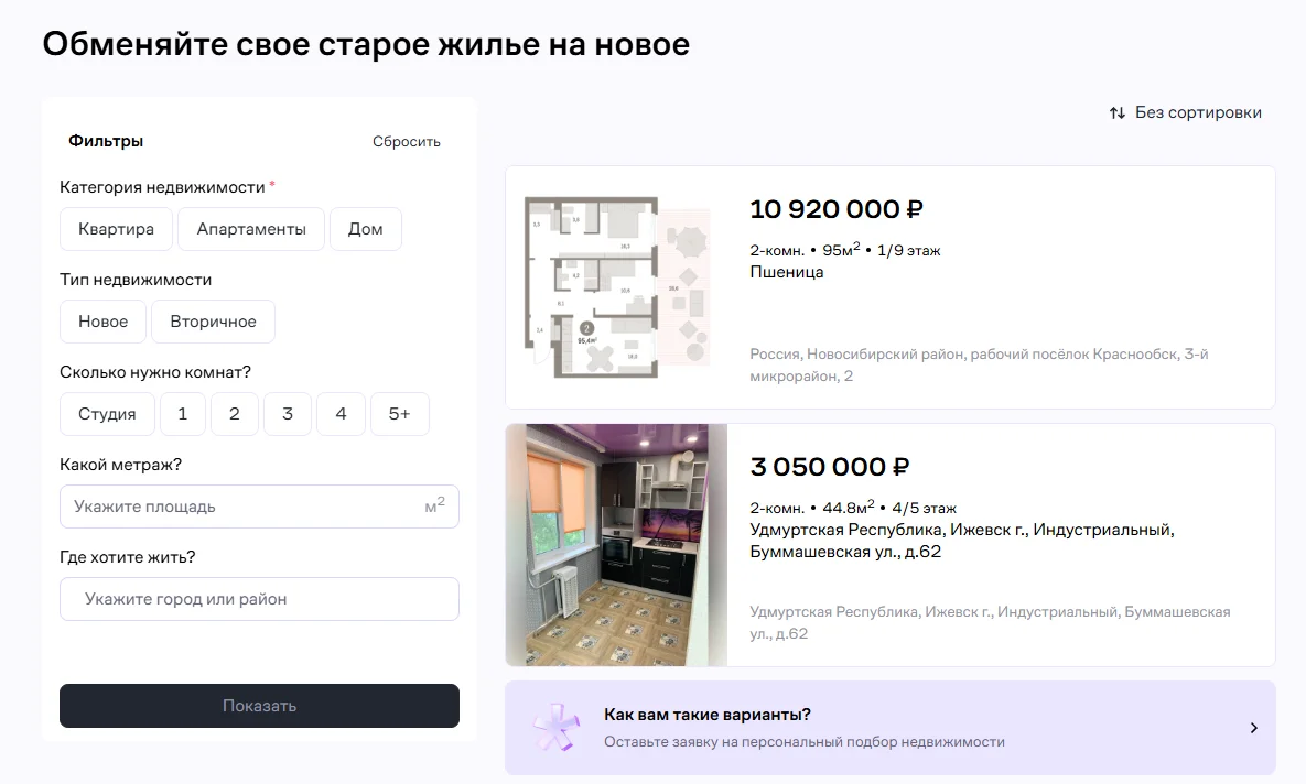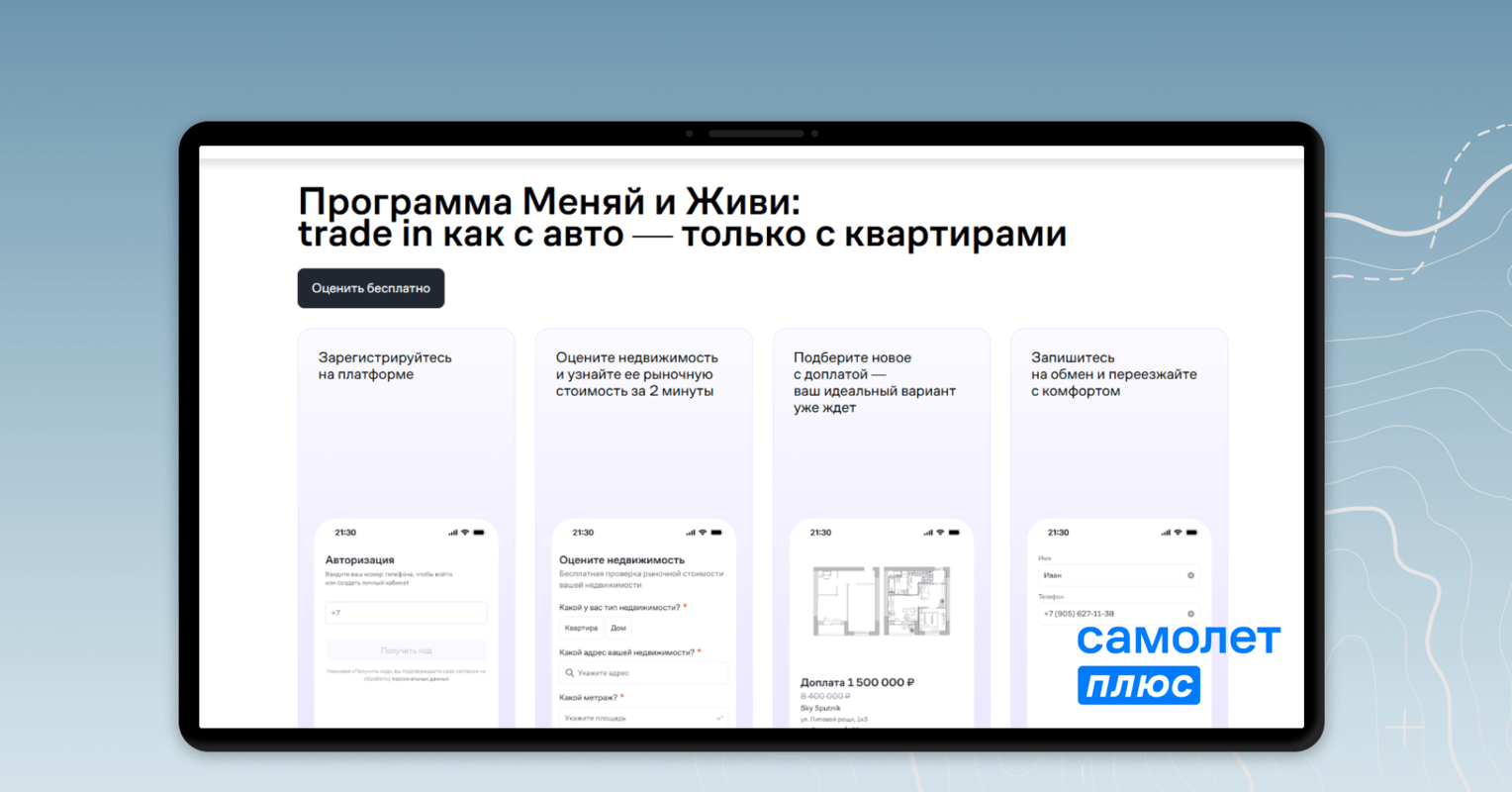 Клиент хотел протестировать гипотезу о востребованности услуги trade-in и собрать первую базу лидов. На сайте уже была размещена информация об обмене недвижимости, но все заявки обрабатывались вручную. Нужно было создать цифровой сервис, который автоматизирует оценку, покажет релевантные варианты и упростит коммуникацию с пользователями.