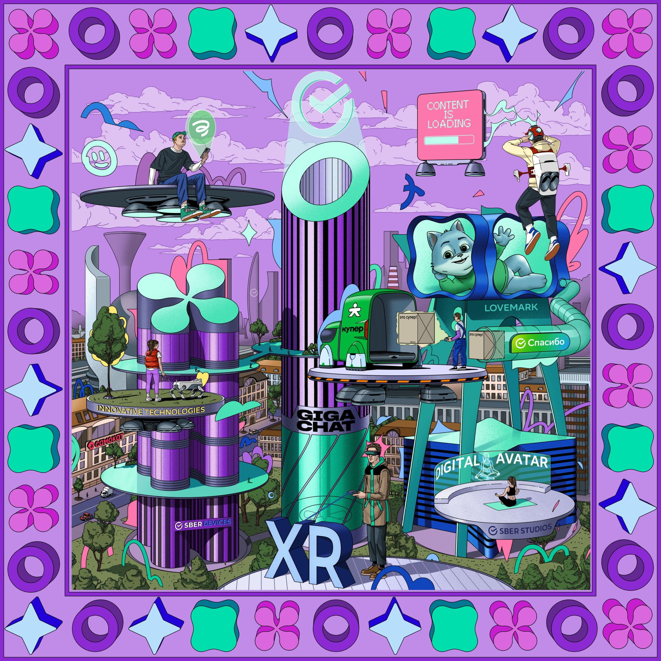 Создан новый визуальный язык. Абстрактные бизнес-направления получили яркое, запоминающееся воплощение в форме целостной «вселенной», которая стала частью фирменного стиля. При этом были органично вплетены не только метафоры экспертиз, но и узнаваемые символы экосистемы и её партнёров, что усилило ассоциативную связь и сделало визуальный нарратив более живым и завершённым.