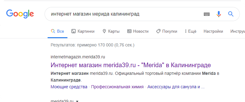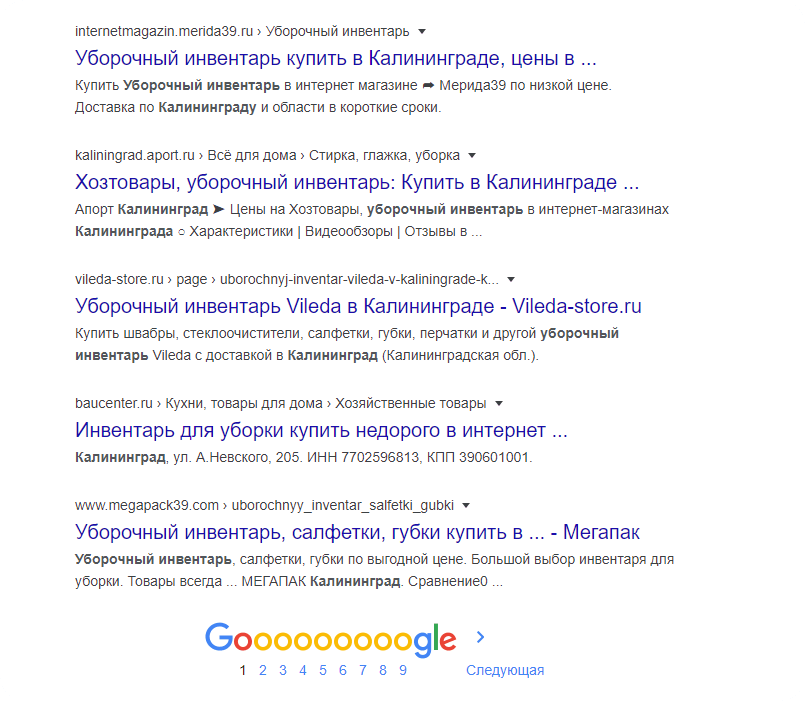 Теперь по запросу «купить уборочный инвентарь в Калининграде» компания ранжируется на первой странице поисковой выдачи.