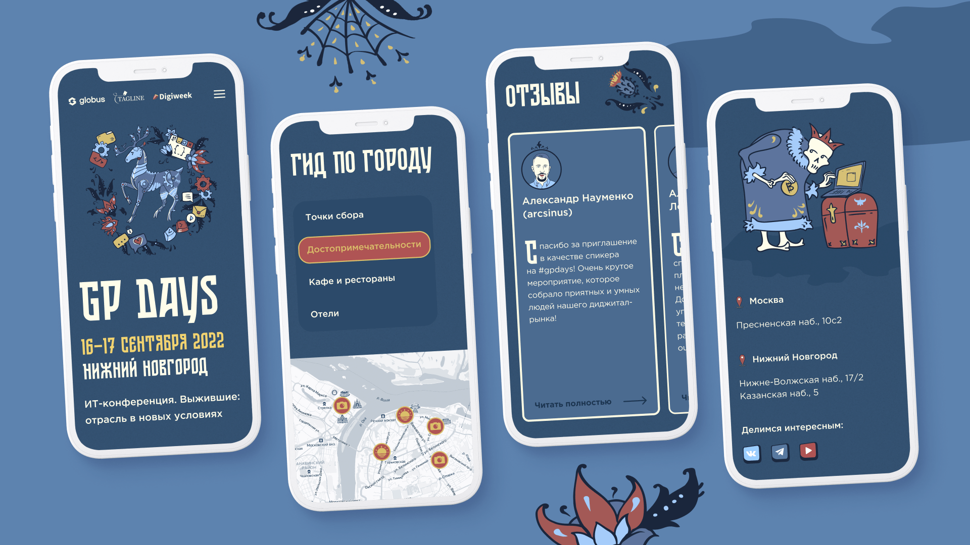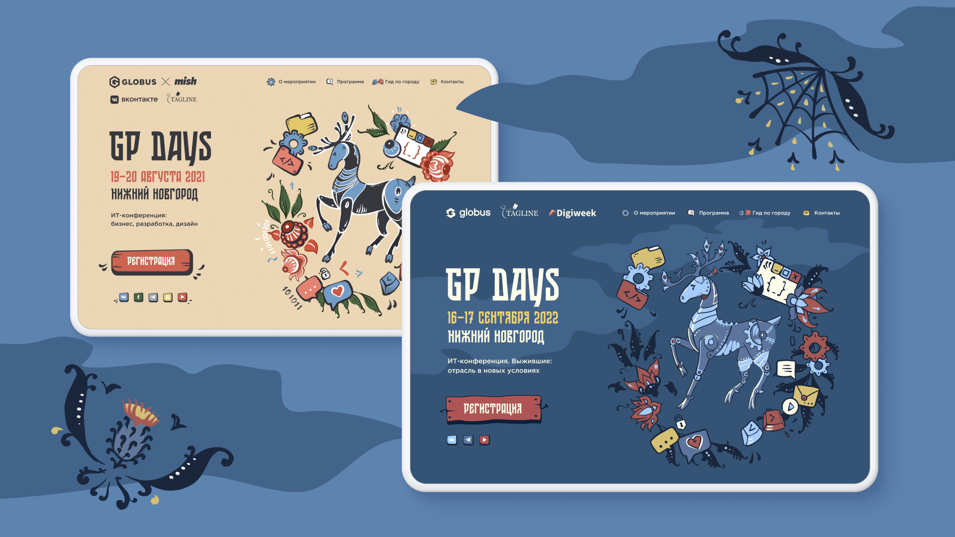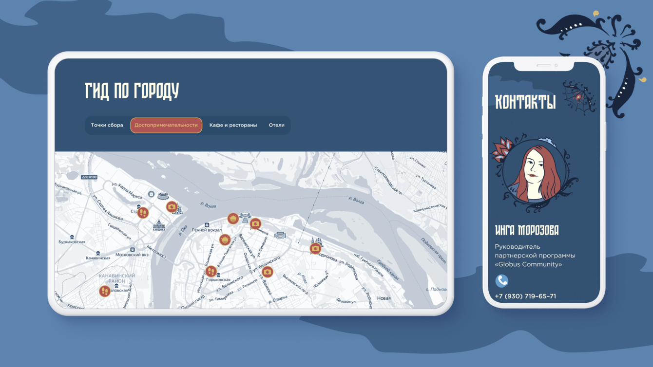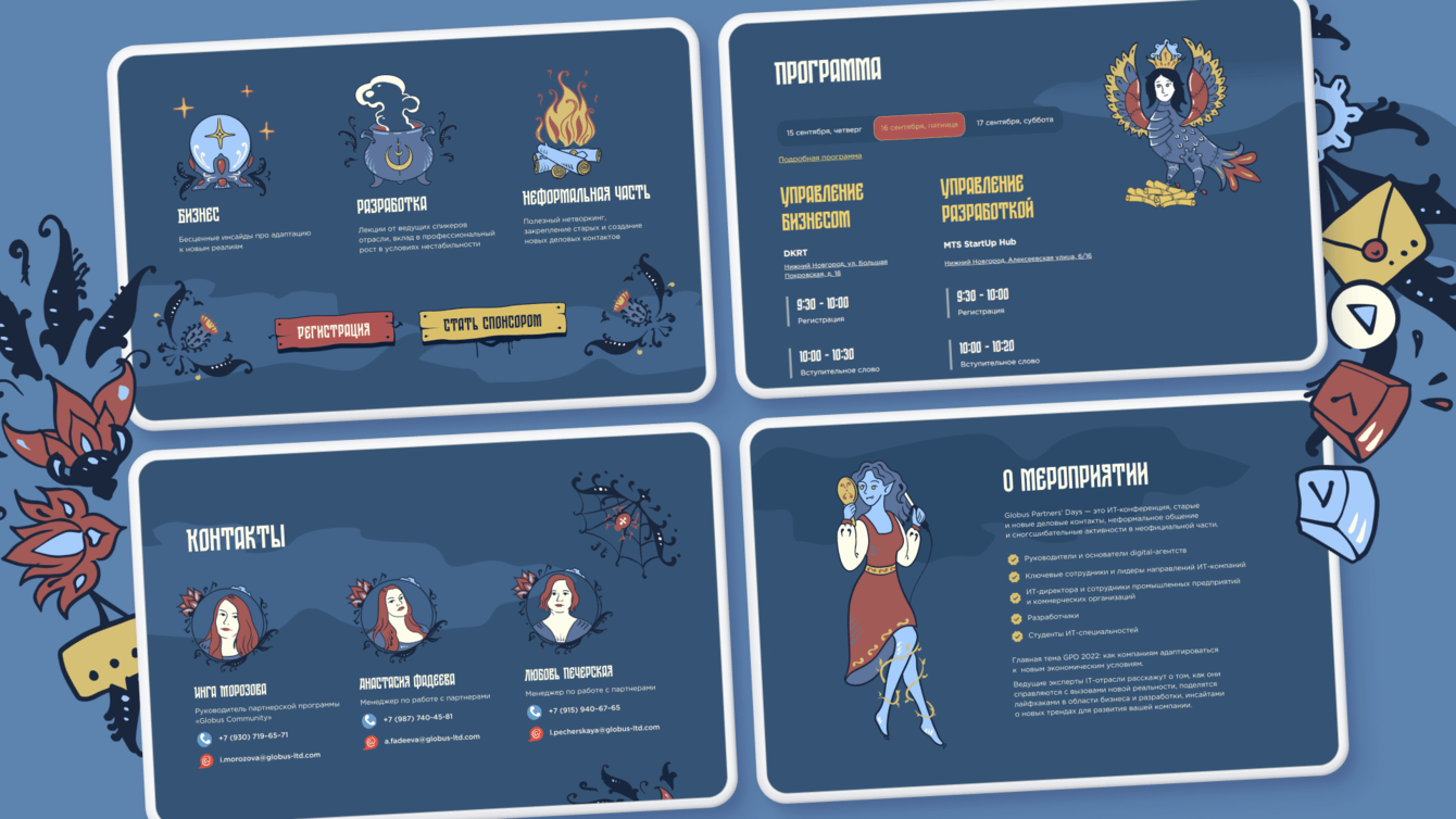 Особое внимание уделялось деталям: в прошлом году кнопки на сайте были по мотивам росписи русских игрушек, в этом году — в виде старых табличек. Кроме того, изменили портреты в блоке «Контакты»: отрисовали в согласованной стилистике людей, которые представляли GP Days.