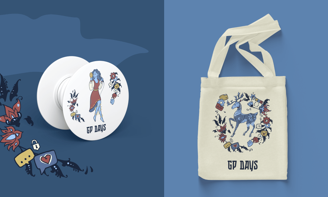 В итоге всех персонажей сайта GP Days можно было легко адаптировать и масштабировать под любые задачи: для лендинга, раздаточных материалов, мерча (шоперы и попсокеты).
