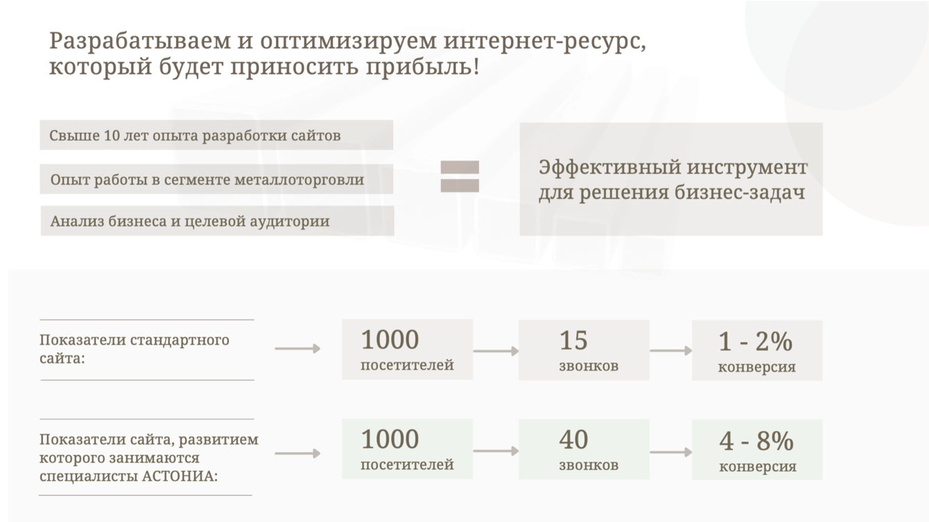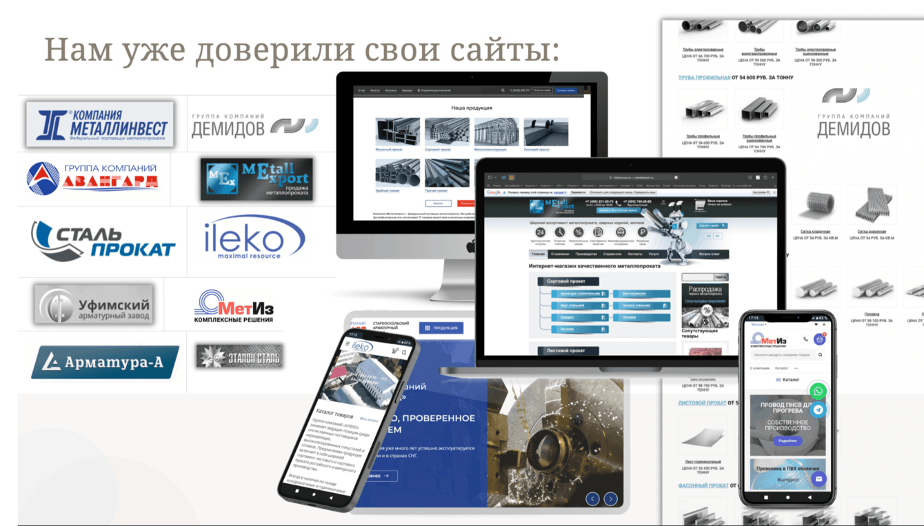 Предприятия, реализующие металлопродукцию, обращаются к нам по одной простой причине: мы уже давно работаем с этим бизнесом. Важно сделать одну и ту же работу несколько раз, но каждый раз искать новые точки развития. Только так получится делать проекты, которые точно принесут пользу клиенту.