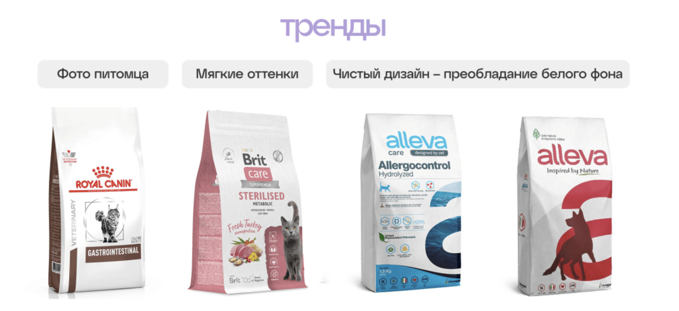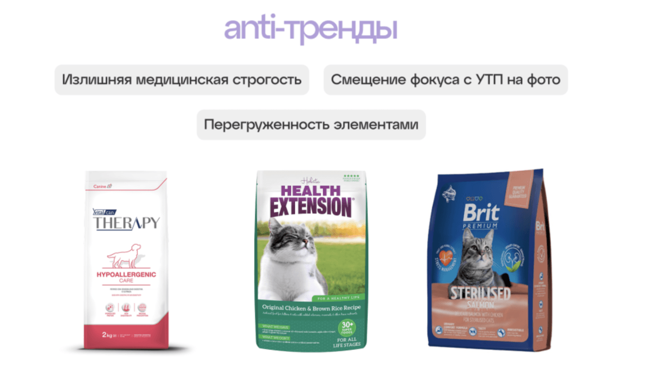 В дизайн-исследовании мы выделили визуальные тренды оформления кормов. Это стало отправной точкой разработки дизайн-концепции.