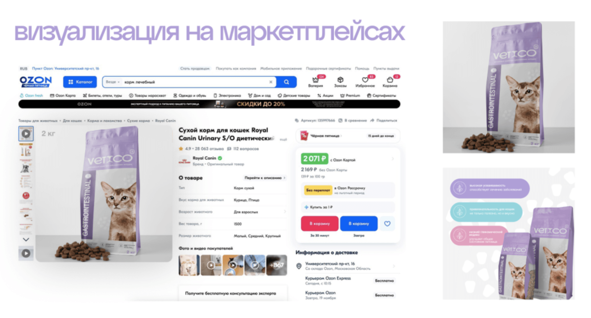 Кормов для питомцев на маркетплейсах множество, просто так стать постояльцем в корзине клиента не так уж и просто. Одних выбирают по советам ветеринаров, других за красивую упаковку. Нашей задачей было грамотно преподнести бренд клиентам, чтобы показать: бренду можно доверять.