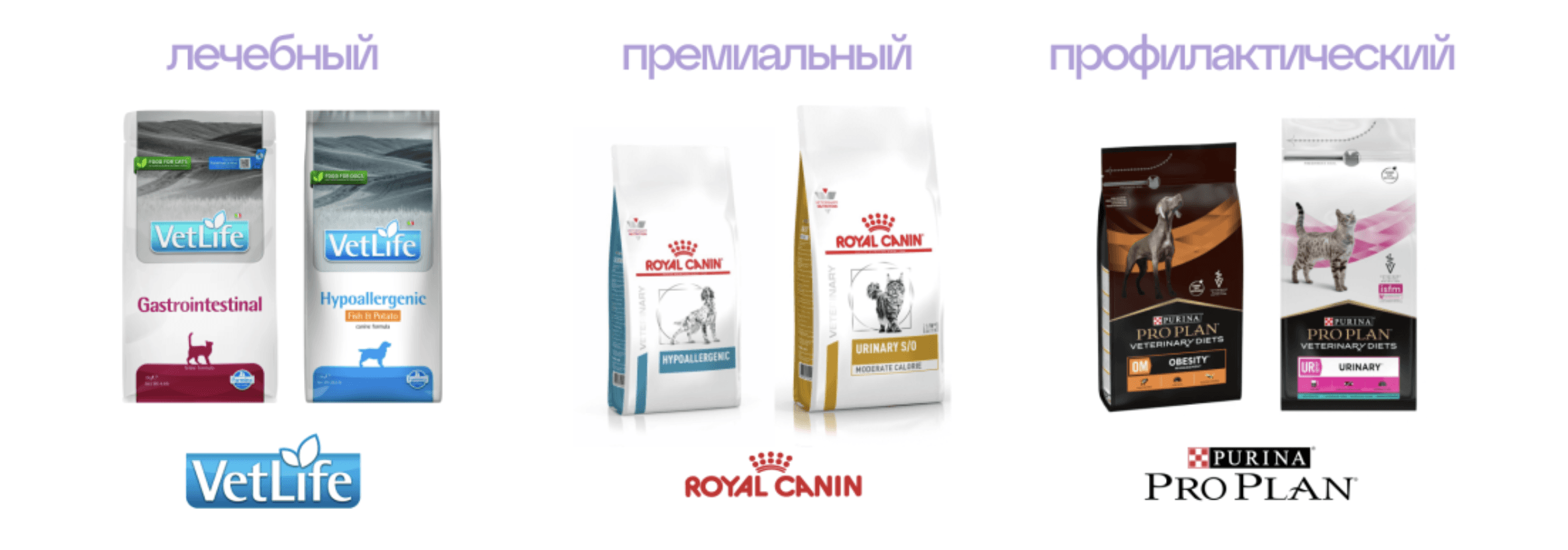 Лидерами продаж в категории лечебных кормов на маркетплейсе являются бренды ProPlan, Royal Canin и Vetlife, в их позиционировании подчёркивается доказанная эффективность, прозрачность составов и честность к потребителю.