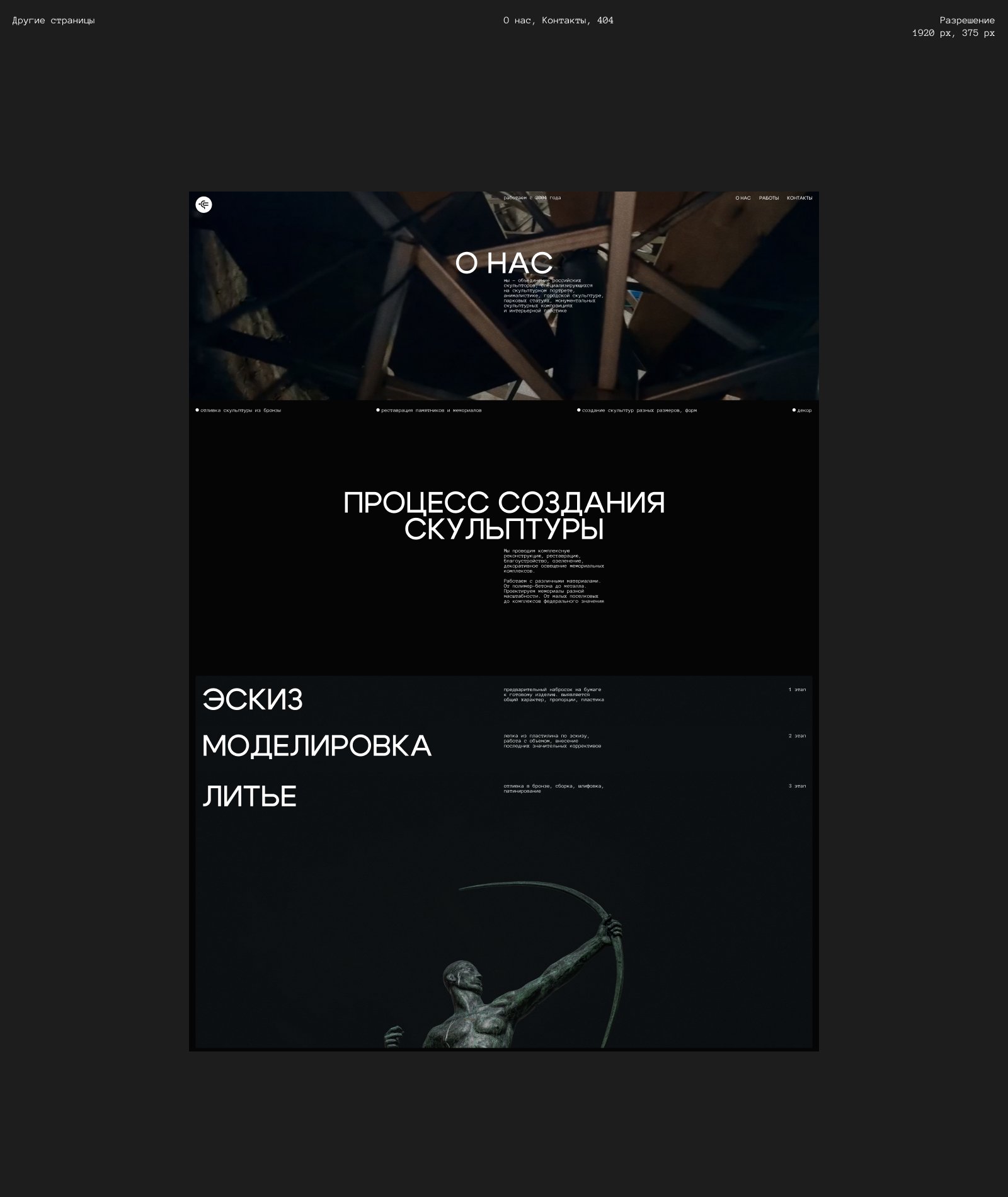 Страница «О нас» рассказывает детально о компании, а также детально о процессе создания скульптур и монументов.
