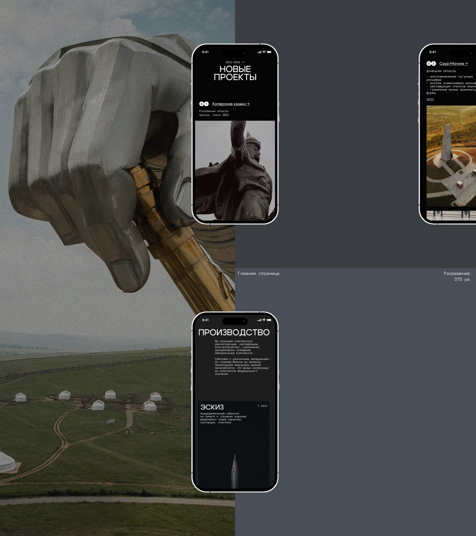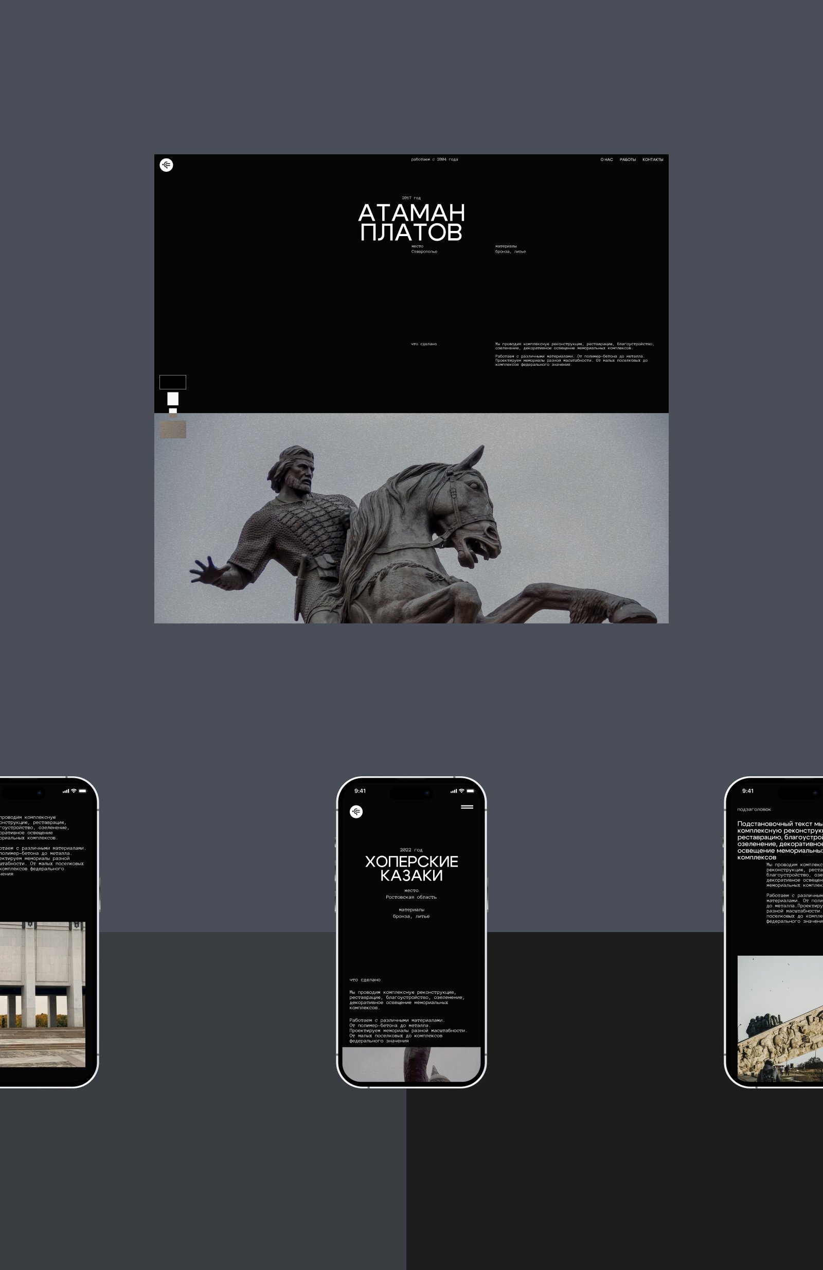 • «Медный голем» выбрал путь, сочетающий лаконичный дизайн с акцентом на фотографиях и видео, передающих процесс создания монументов.
