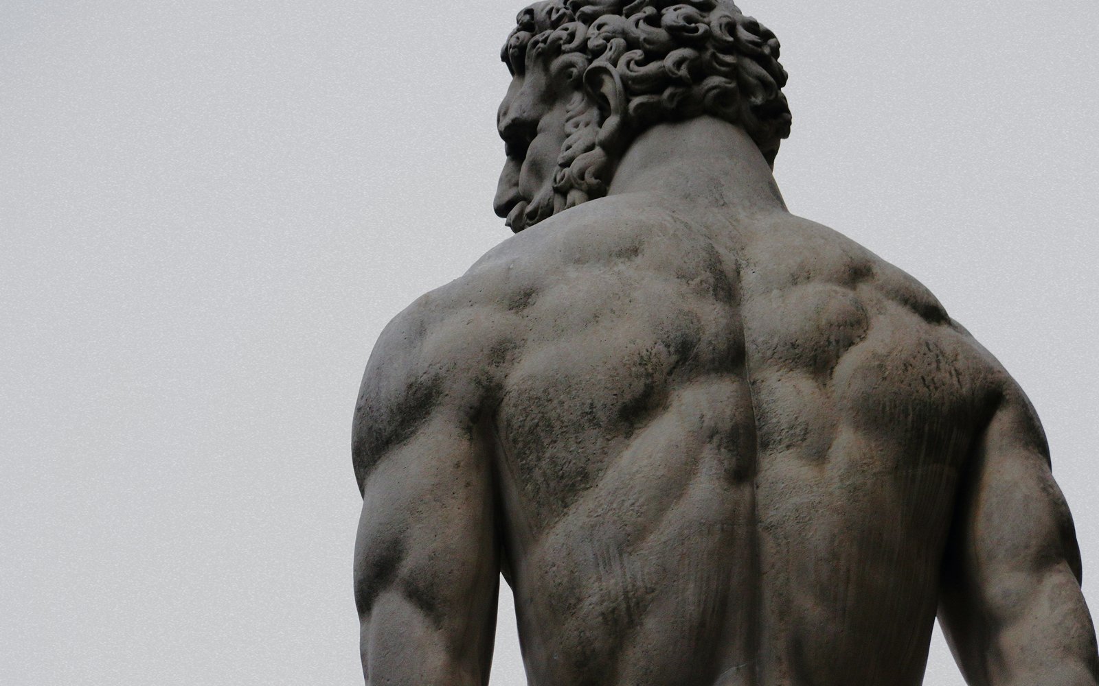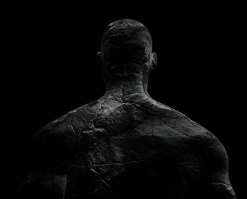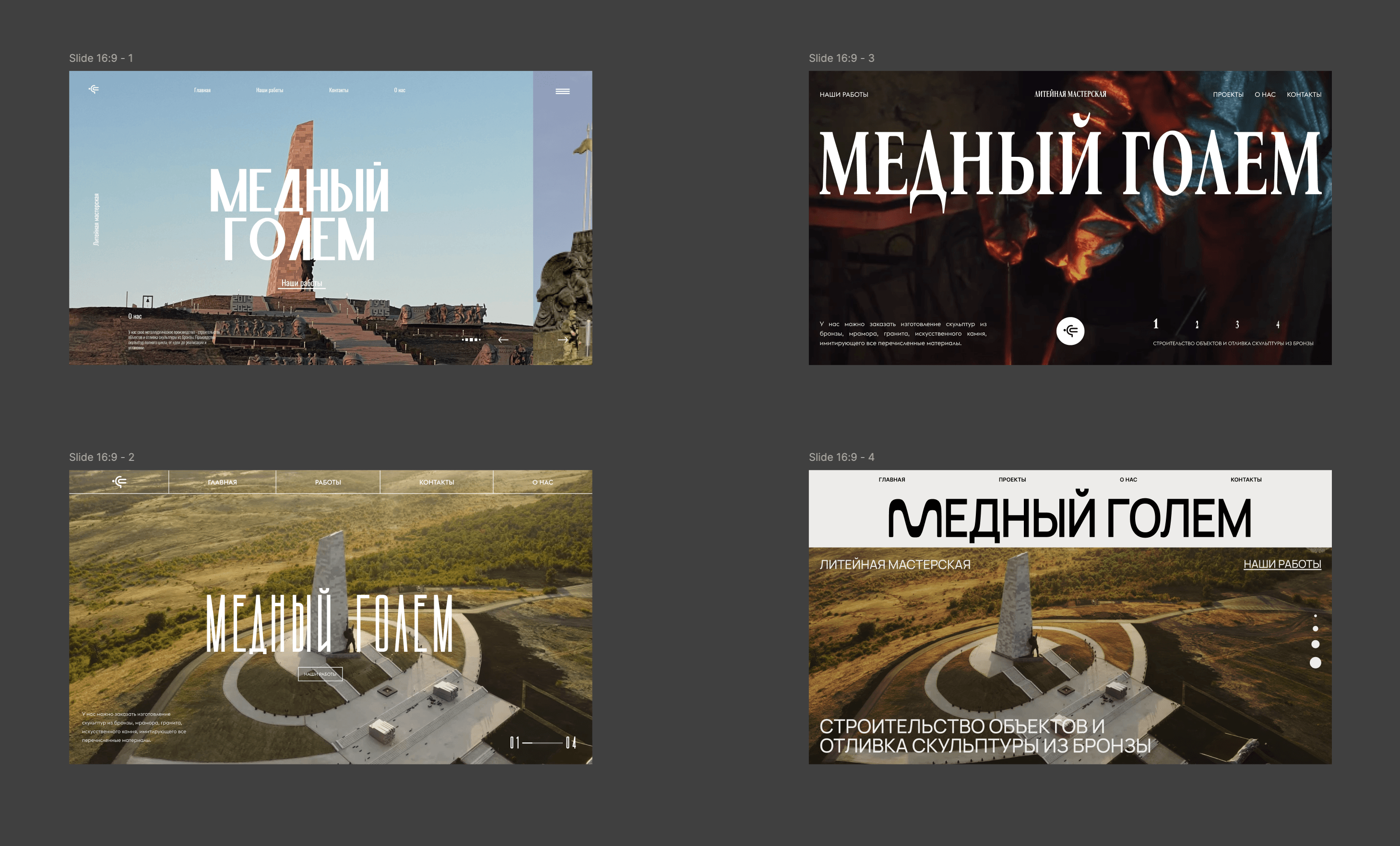 Мы решили изменить первый экран, но без радикальных мер: композиция и расположение элементов нас устраивали, а вот фоновое видео рабочего процесса уже не вызывало нужных эмоций. Так и родилась идея найти «железного/каменного» человека — мощного, величественного, идеально вписывающегося в тематику памятников и образ «Медного Голема».