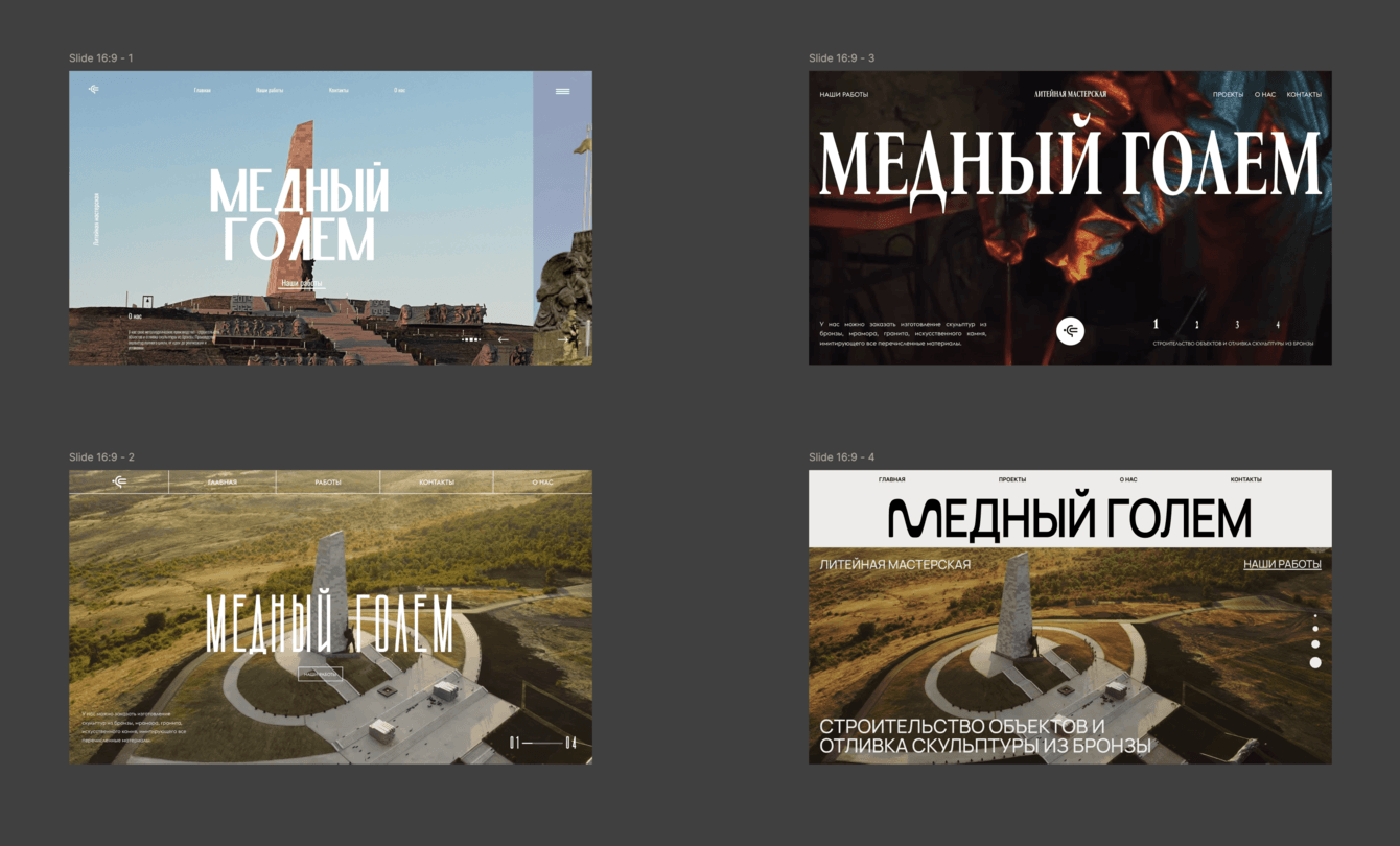 Любой проект начинается с погружения в эстетику и ожидания клиента. Мы проанализировали мировые сайты в сфере культуры и архитектуры, где визуальная выразительность выходит на первый план. Наша цель — передать атмосферу «Медного голема» и подчеркнуть грандиозность его проектов.