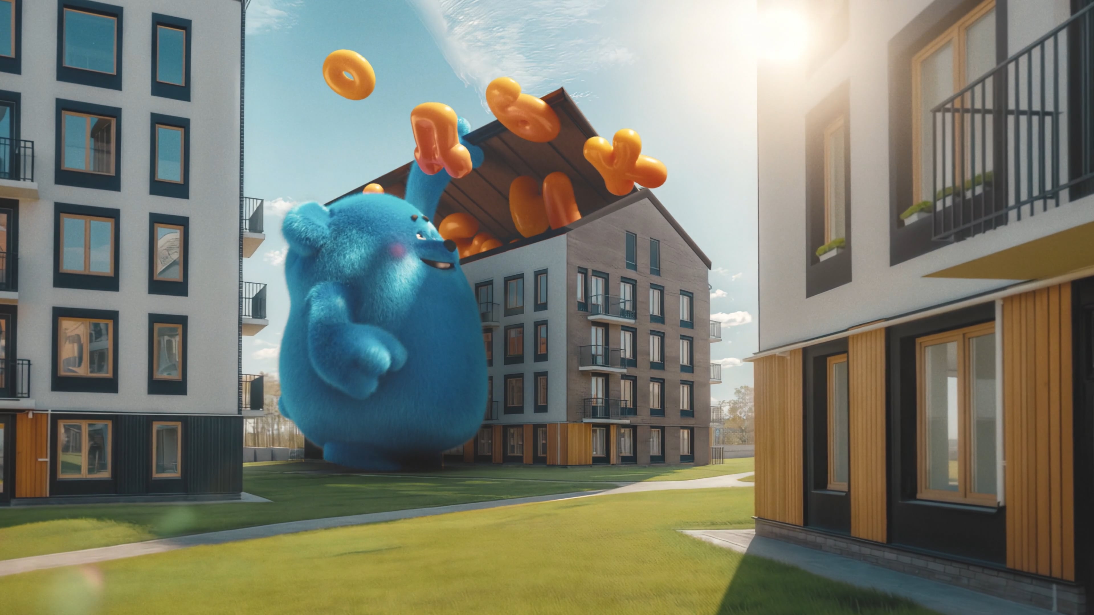 Вместо съёмок мы использовали AI-видео с реальными кадрами территории ЖК. На эти кадры были вручную интегрированы CGI-персонажи, включая медведя «Мич». Такой подход позволил нам сэкономить бюджет, при этом сохраняя высокое качество и уникальность рекламы.