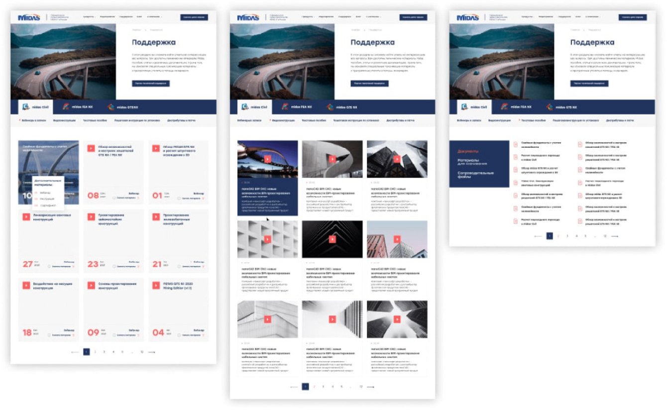 На сайте MIDAS IT есть раздел с поддержкой: записи вебинаров, инструкции и учебные материалы, программные утилиты и нужная документацию по использованию ПО. Блок с вебинарами мы реализовали в виде афиши с календарной сеткой. Остальные материалы разместили на вкладках.