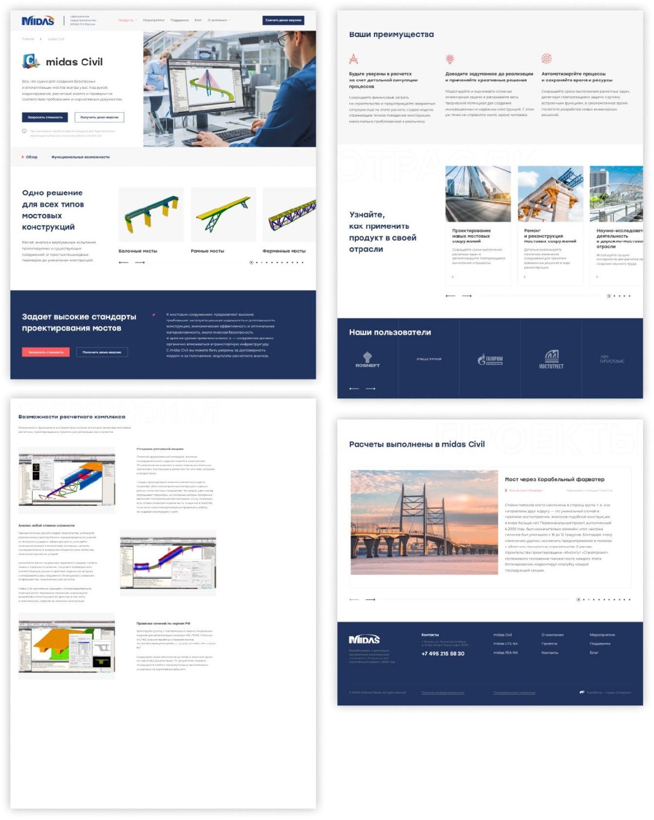 Для трех программных продуктов, предлагаемых компанией MIDAS мы подготовили детальные страницы, где поэтапно рассказали об их возможностях: показали, что умеет ПО на визуальных примерах моделируемых объектов; отразили преимущества для заказчика и привели список возможных областей применения — оформили это в галереях с горизонтальным скроллом; расписали возможности ПО с помощью скриншотов и добавили несколько кнопок заказа демо-версии, чтобы не приходилось возвращаться за этим наверх страницы.
