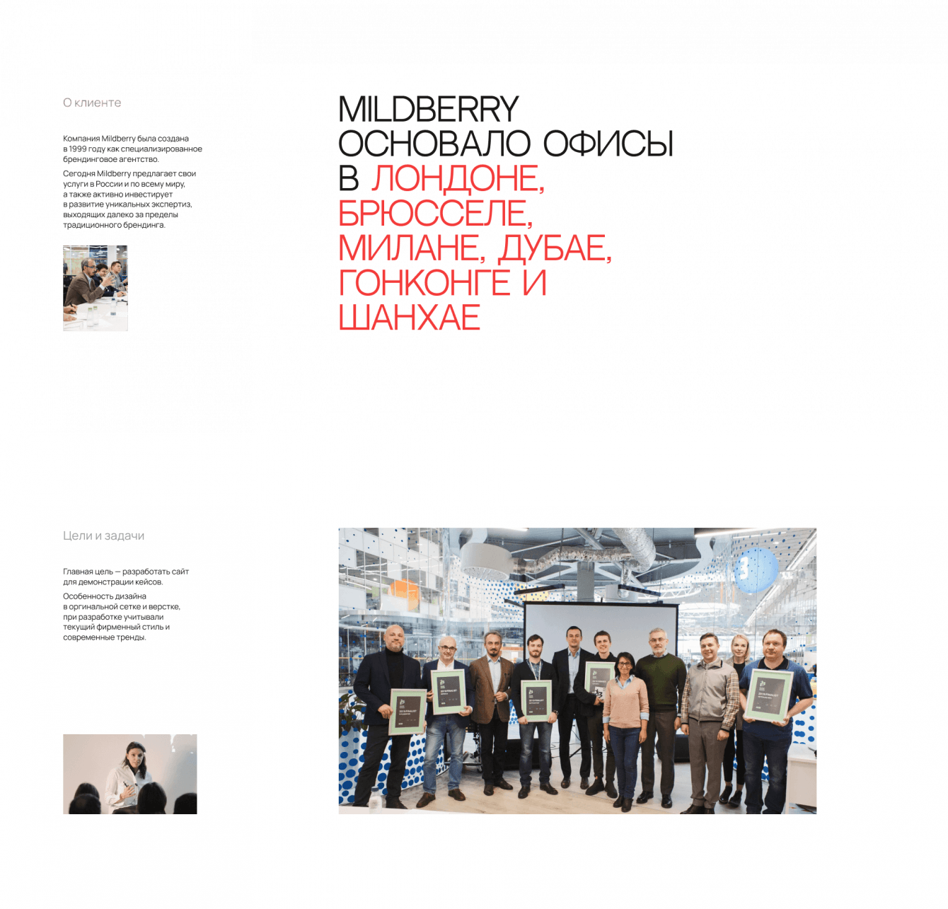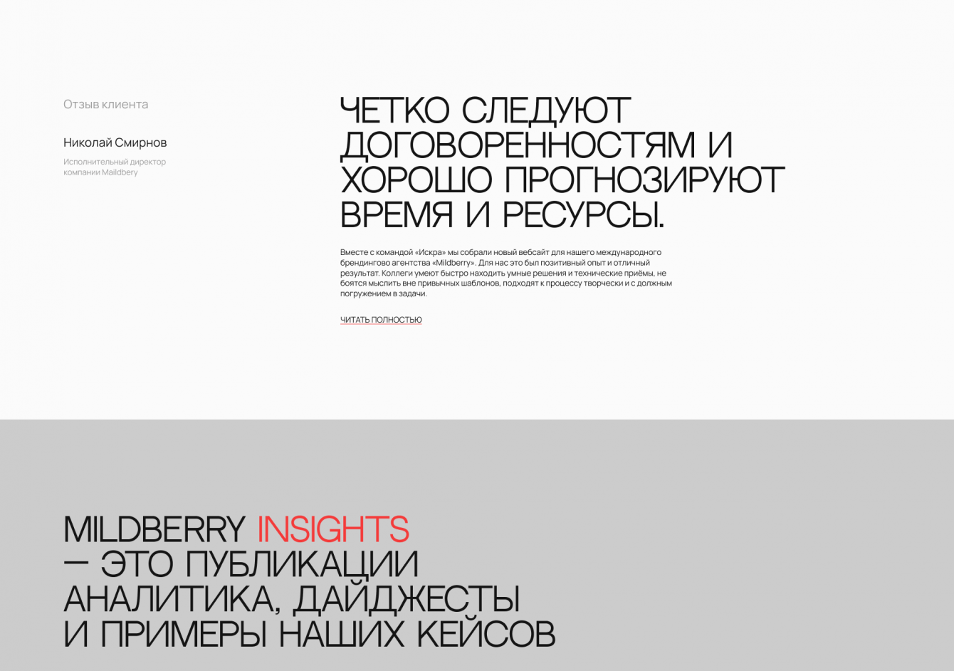 Вместе с командой «Искра» мы собрали новый вебсайт для нашего международного брендингового агентства «Mildberry». Для нас это был позитивный опыт и отличный результат. Коллеги умеют быстро находить умные решения и технические приёмы, не боятся мыслить вне привычных шаблонов, подходят к процессу творчески и с должным погружением в задачи.