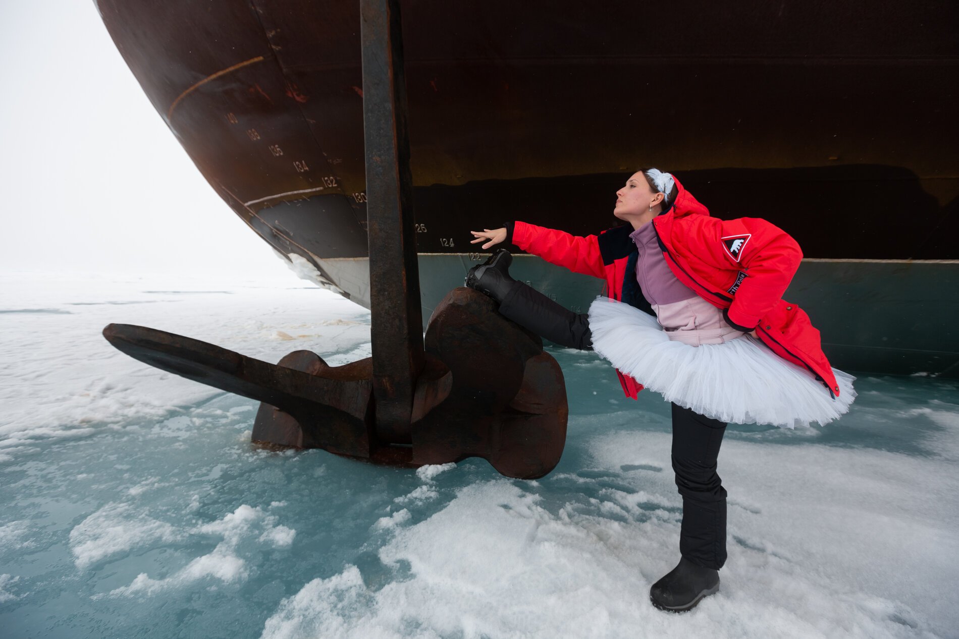 На локации, в точке географического Северного полюса, сначала все участники проекта сделали основные рабочие дела и провели мероприятия для участников круиза. После этого Даша переоделась в пачку и пуанты, утеплилась полярной одеждой и спустилась на лёд, по дороге размявшись на якоре ледокола, как на балетном станке.