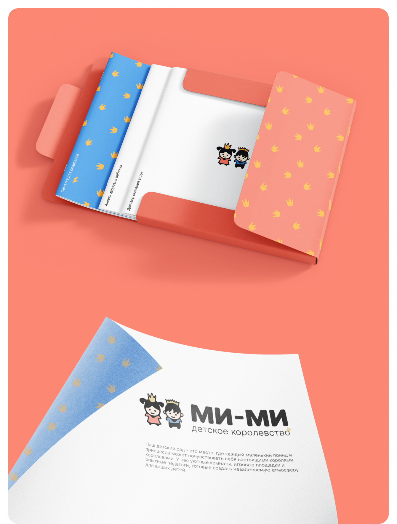 Слоган "Маленькие Короли и Королевы" подчеркивает философию, что каждый ребенок - это уникальная личность, способная к большим делам. Логотип "Ми-Ми" представляет девочку и мальчика с короной, что подчеркивает их особенность и важность. Цветовая палитра фирменного стиля включает пастельные голубой, розовый и желтый цвета, которые создают атмосферу нежности и тепла. Паттерн короны, являющийся символом королевского статуса, встречается в различных элементах нашего дизайна, напоминая детям о том, что они - настоящие короли и королевы детского сада.