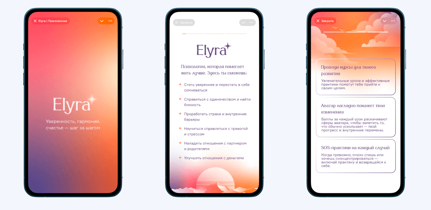Пользователь начинает работу с приложения с серии сторис, которые объясняют суть продукта. Затем он заполняет анкету, указывая имя, пол, дату рождения и email. Далее выбирает визуального аватара и интересующие его темы — на основании этого формируется персональный подбор курсов.