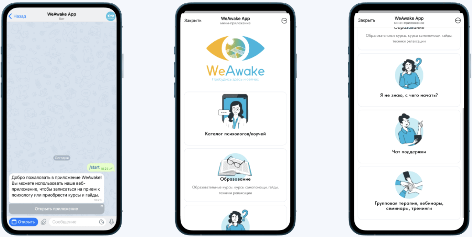 WeAwake — это цифровая платформа, состоящая из телеграм-бота и веб-приложения, предназначенная для оказания психологической поддержки пользователям. Платформа предлагает тестирование для самодиагностики, доступ к каталогу квалифицированных психологов, возможность бронирования онлайн-консультаций, а также доступ к образовательным материалам и групповым терапиям. Инструмент помогает пользователям лучше понять свое психологическое состояние и оперативно находить специалистов, подходящих под их запросы.