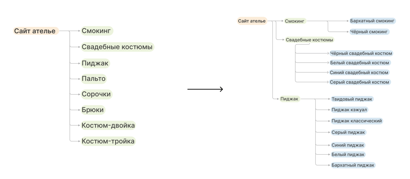 Важно отметить, что изначальная структура сайта была функциональной, но мы дополнили её необходимыми страницами для продвижения. Например, добавили страницы, ориентированные на узкие ниши — «пошив двубортного пиджака для юриста», «пошив пиджака для конференции» и так далее. Эти страницы были не просто добавлены, а тщательно проработаны с учётом специфики целевой аудитории, что позволило повысить точность попадания по коммерческим запросам.