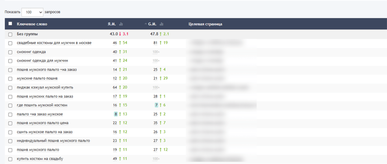 Мы отказались от очевидных запросов вроде «мужской костюм на заказ» и сосредоточились на более точных формулировках, таких как «пошив двубортного пиджака для юриста» или «пошив пиджака для деловых встреч». Эти запросы позволили нам привлечь более релевантный трафик, который был готов к покупке и отвечал требованиям премиального сегмента.