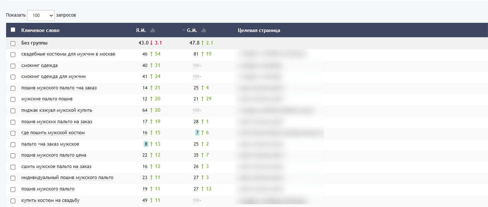 Мы отказались от очевидных запросов вроде «мужской костюм на заказ» и сосредоточились на более точных формулировках, таких как «пошив двубортного пиджака для юриста» или «пошив пиджака для деловых встреч». Эти запросы позволили нам привлечь более релевантный трафик, который был готов к покупке и отвечал требованиям премиального сегмента.