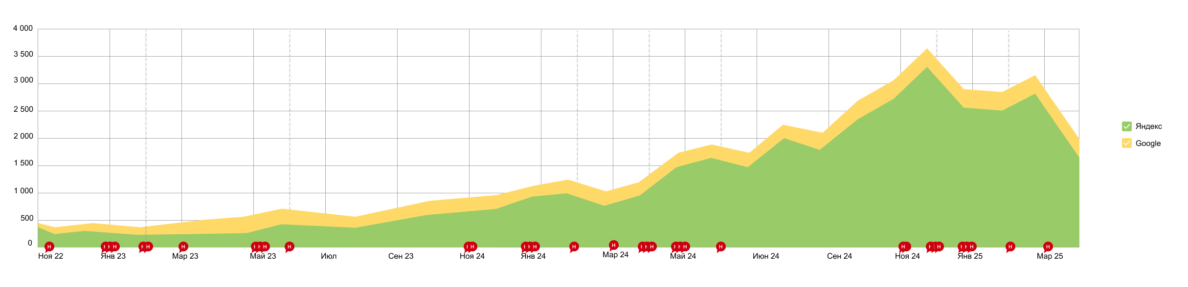 * Google: трафик также увеличивался, но более плавно. Пик был в январе 2024 (406 визитов), в 2025 году наблюдается небольшое снижение.