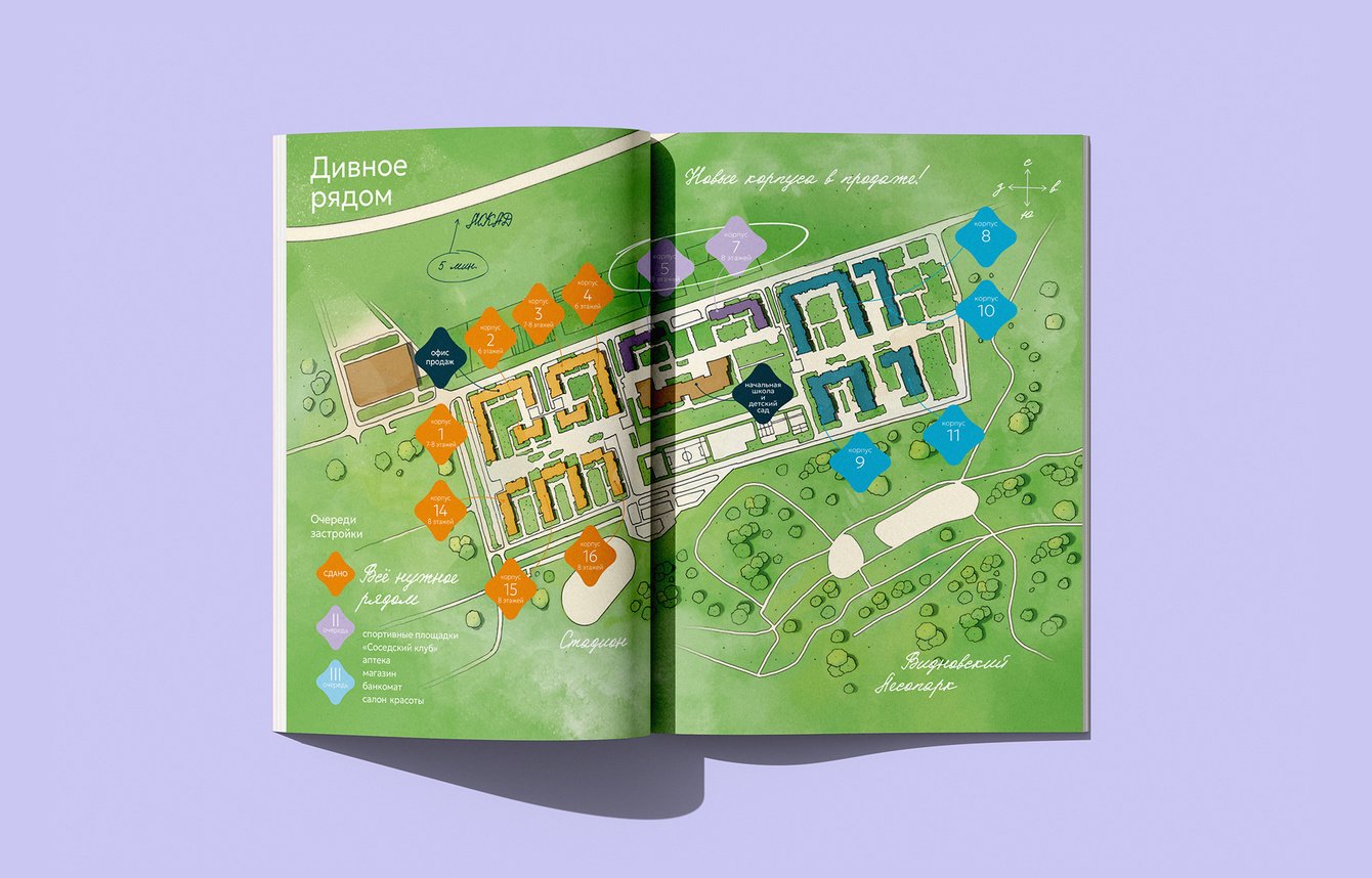 Первую айдентику «Дивного» мы делали в 2018 году, для старта первой очереди. Бренд прижился, стал узнаваемым, его запомнили и полюбили. Но к запуску следующей очереди выяснилось, что стилю пора повзрослеть. Где-то он стал сложным в работе, где-то начал хуже читаться на скорости, а где-то просто устал за годы активного использования. В общем, тот самый момент, когда бренд уже вырос, а одежда ещё из прошлой версии.