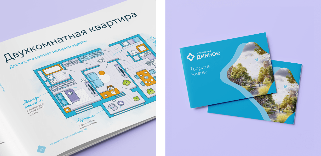 Дальше мы привели логотип к понятной системе: основная версия, знак отдельно, текстовая версия для случаев, где важна компактность, а также версии с дескриптором «миниполис» и со слоганом «Творите жизнь!». Добавили правила для монохрома, минимальных размеров и охранных полей. Не самое романтичное место в брендбуке, но именно оно спасает стиль от вечного «чуть-чуть подвинь и сделай побольше».