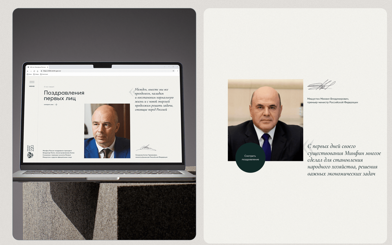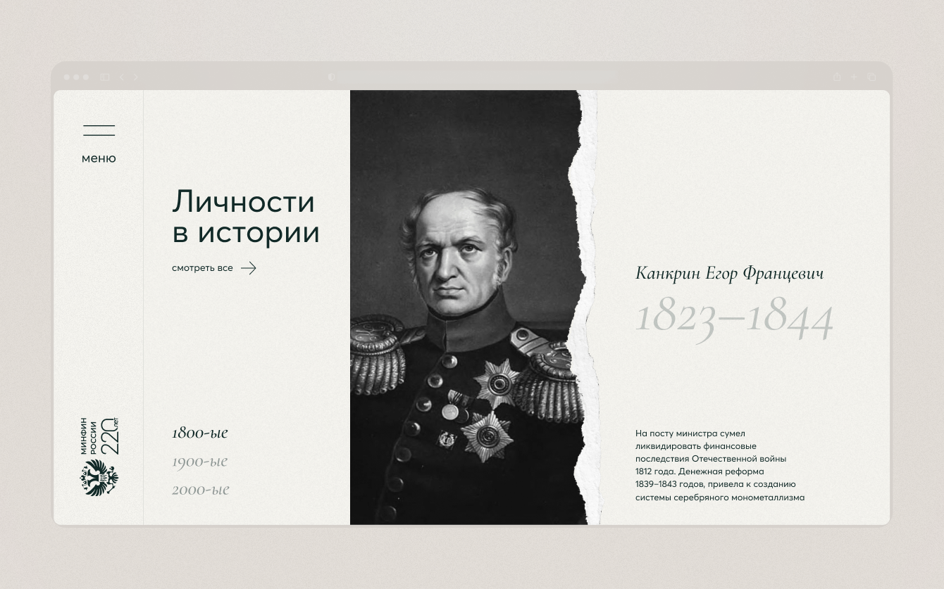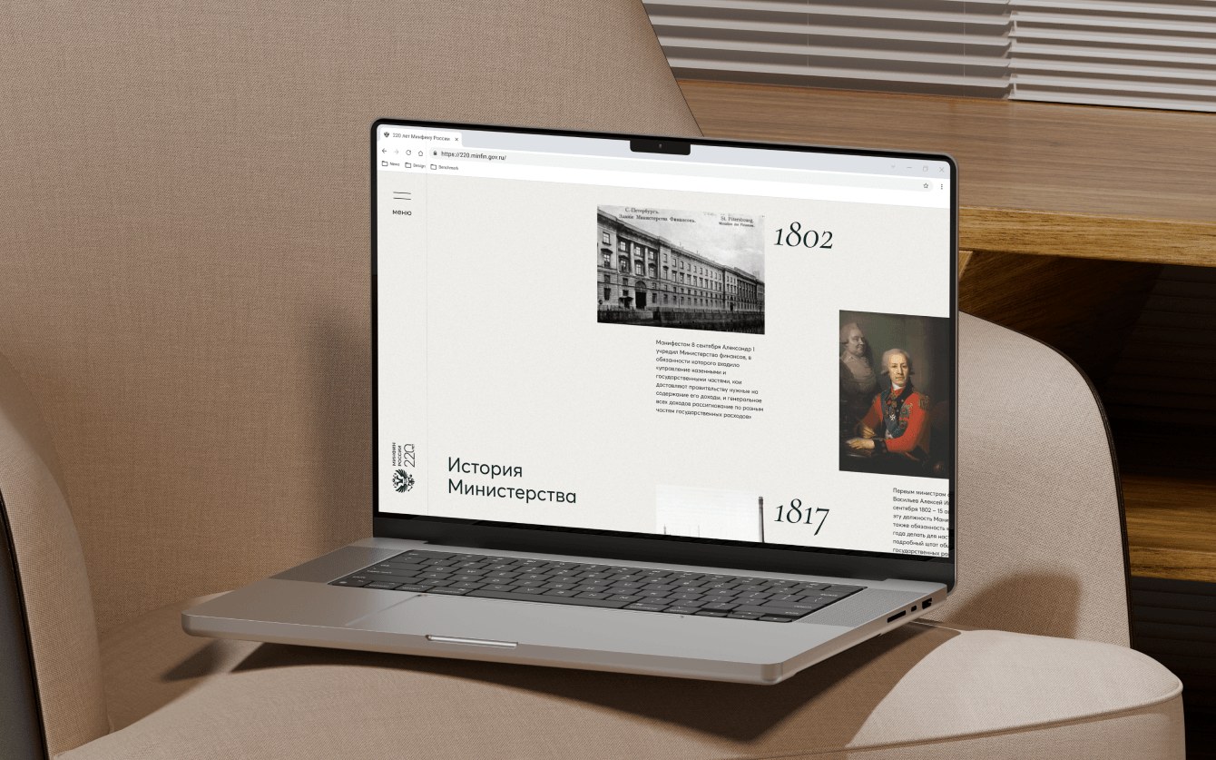 Проект объединяет архивные материалы, ключевые этапы развития финансовой системы и значимые достижения Министерства, превращая их в интерактивный пользовательский опыт. История подаётся через последовательный сторителлинг, где каждый этап раскрывает вклад Минфина в формирование экономической политики страны.