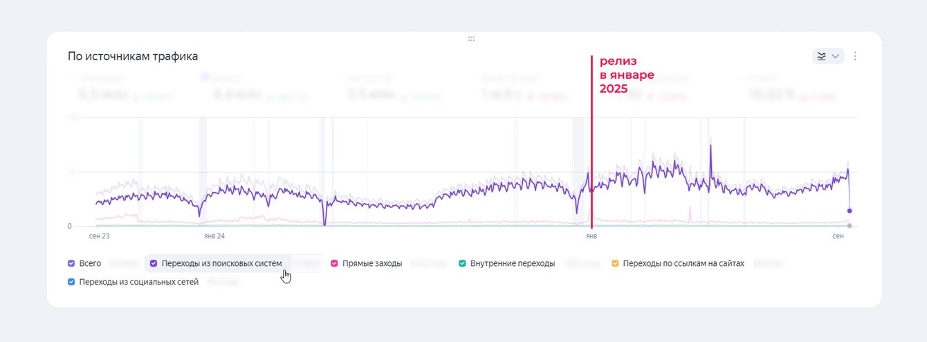 Окончательный релиз нового сайта состоялся в январе 2025 года. По отчету из Яндекс Метрики видим, что трафик из поисковых систем не просел, а наоборот продолжил постепенно расти. За что отдельно благодарим нашу сеошницу, тщательно отследившую все возможные “подводные камни”, редиректы и корректность работы страниц.