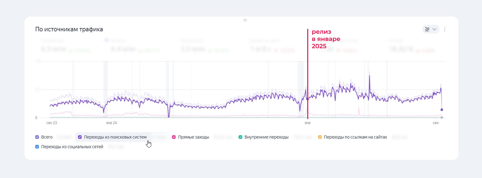 Окончательный релиз нового сайта состоялся в январе 2025 года. По отчету из Яндекс Метрики видим, что трафик из поисковых систем не просел, а наоборот продолжил постепенно расти. За что отдельно благодарим нашу сеошницу, тщательно отследившую все возможные “подводные камни”, редиректы и корректность работы страниц.