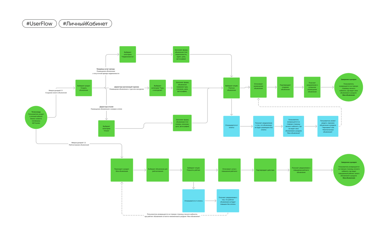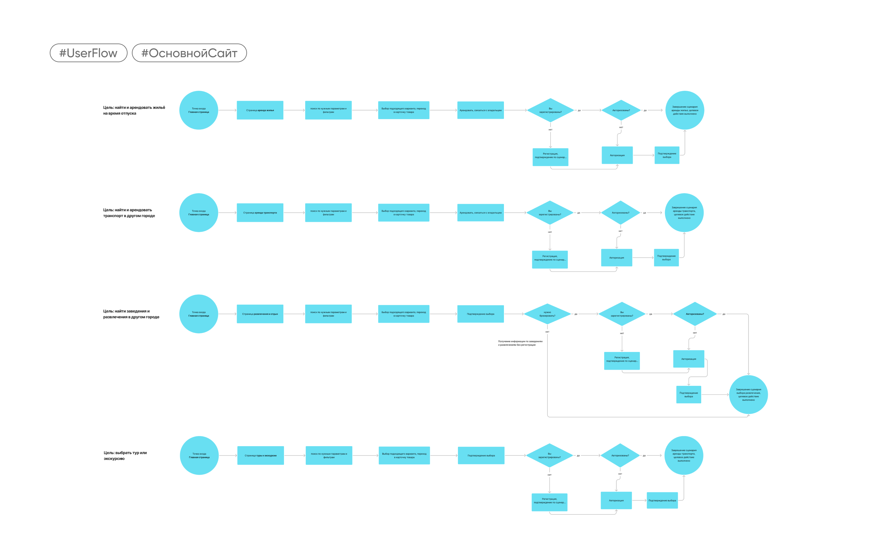 На основе ТЗ и данных конкурентного анализа мы составили Userflow — схему взаимодействия пользователя с платформой.Это помогло: