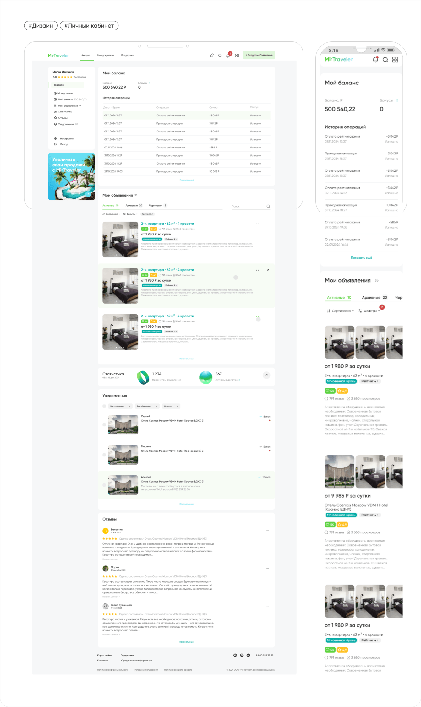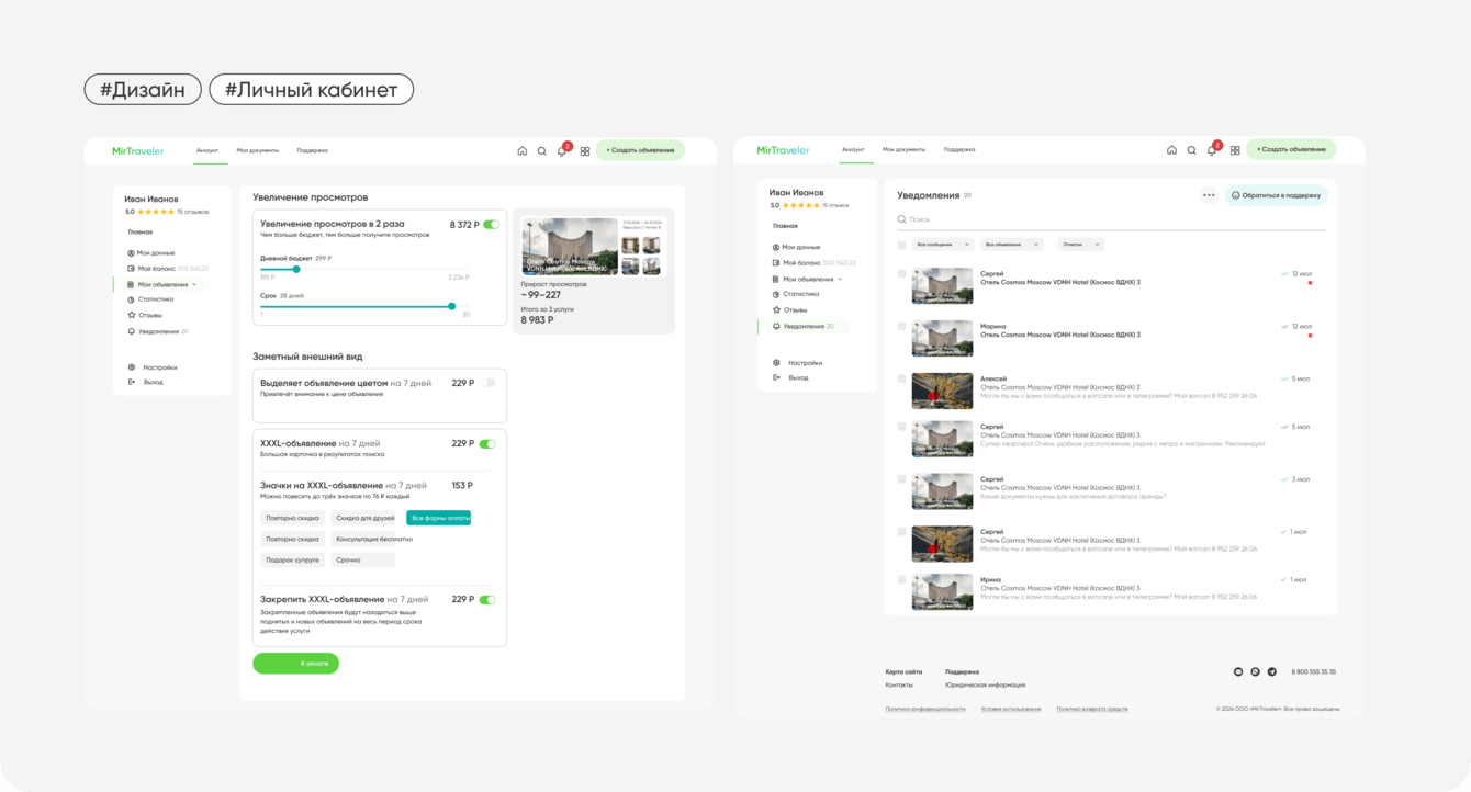 Мы показали, как новый дизайн и функционал улучшат пользовательский опыт. Структура и логика личного кабинета позволит пользователю без труда разместить оъявление, выбрать нужный тариф и проанализировать свой доход в процессе работы с платформой. Интуитивно понятная навигация улучшит пользовательский опыт. Эффективная система администрирования упростит учет и редактирование данных.