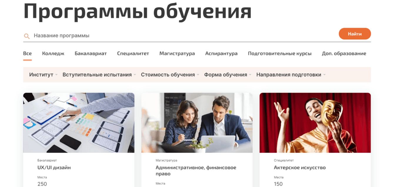 В разделе реализован поиск по названию программы, настроена фильтрация по параметрам: институт, вступительные испытания, стоимость обучения, форма обучения, направления подготовки.