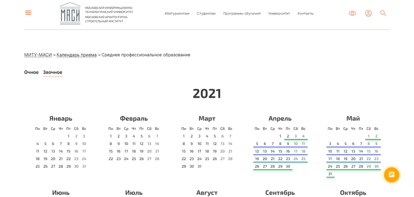 Реализован удобный сервис «Календарь приема», в котором можно посмотреть расписание подготовительных программ, приема документов на очное/заочное обучение.