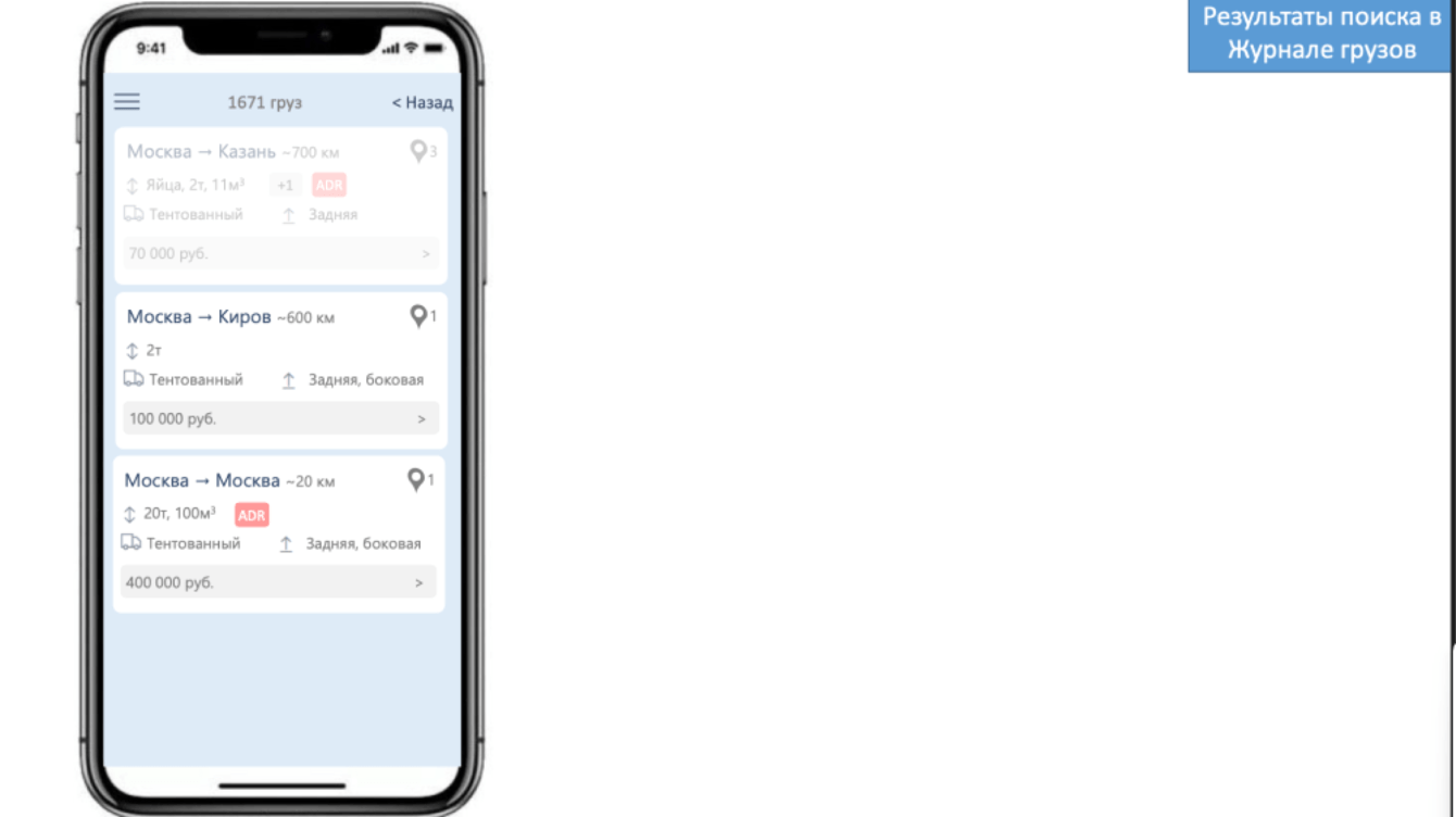 Реализовали блоки фильтрации и поиска заявок для перевозчиков и заказчиков. Это позволило пользователям быстро находить актуальные грузы и откликаться на них, упрощая рабочий процесс и снижая время на обработку заказов.