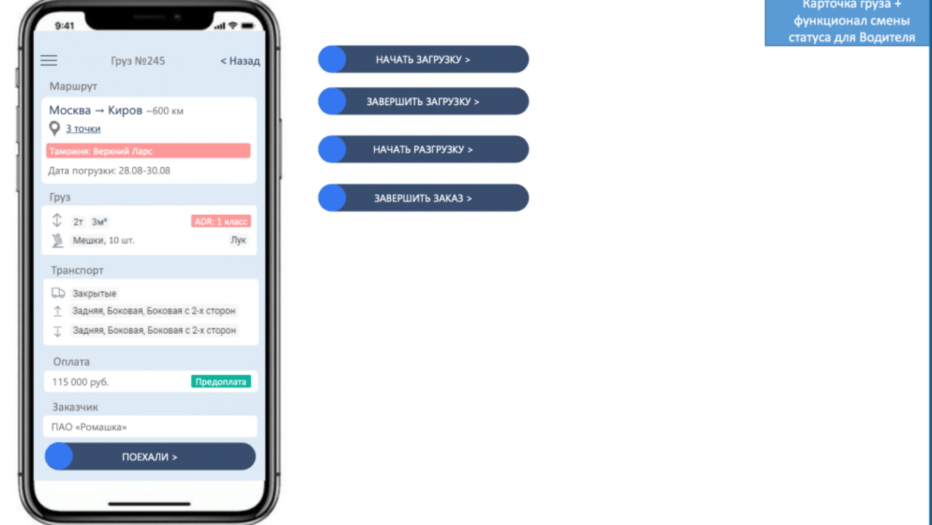 Для водителей была создана карточка груза с возможностью изменения статуса рейса (например, «Груз отправлен», «В пути», «Загрузка» и т.д.), что обеспечило прозрачность всех этапов доставки.