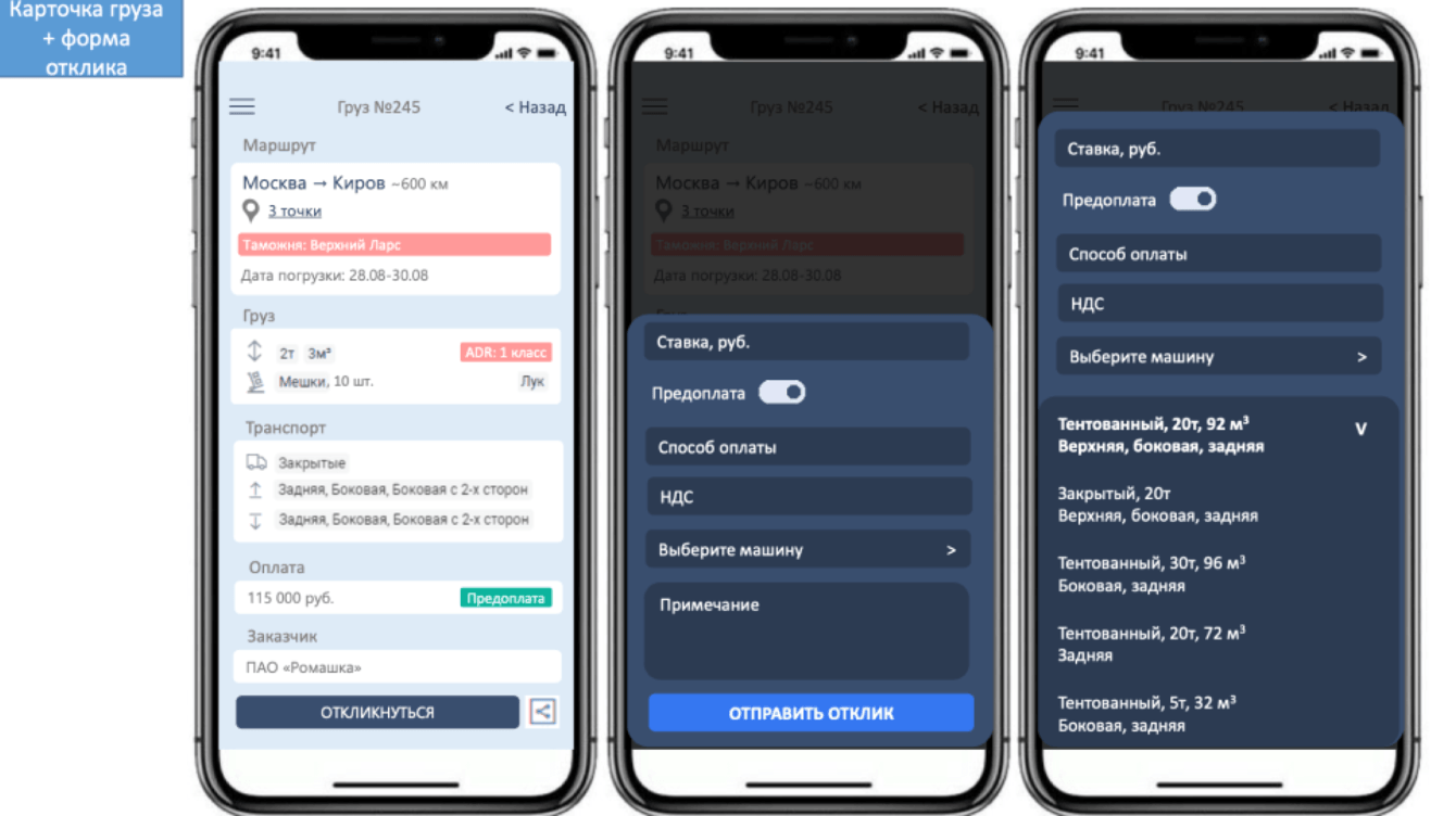 Мы предложили разработать приложение с модулями для каждого типа пользователей: перевозчиков, заказчиков и водителей. В зависимости от роли пользователя интерфейс подстраивается под его задачи: например, заказчики могут создавать и отслеживать заявки на груз, перевозчики — искать подходящие заказы, а водители — управлять статусами своих рейсов. Это позволило каждому пользователю получать нужные инструменты, не перегружая интерфейс лишними функциями.