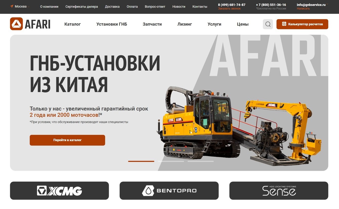 Наш клиент — компания АФАРИ, официальный дилер ведущих мировых производителей горизонтально-направленных буровых установок (ГНБ), включая XCMG и другие бренды. Компания занимается поставкой, продажей и сервисным обслуживанием буровой техники по всей России.