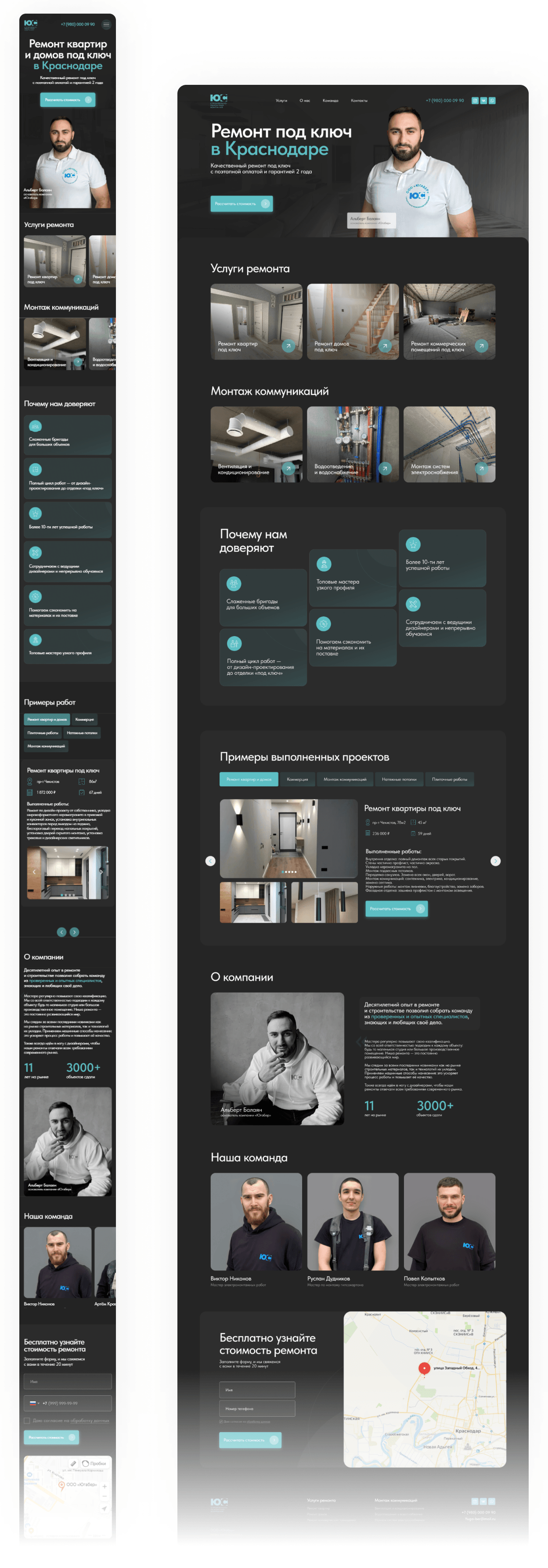 При разработке дизайна сайта мы уделили особое внимание функциональности и удобству использования. Удобная навигация по сайту позволяет быстро и легко ознакомиться с услугами, примерами выполненных работ, познакомиться с командой, связаться для консультации, а также рассчитать примерную стоимость ремонта.