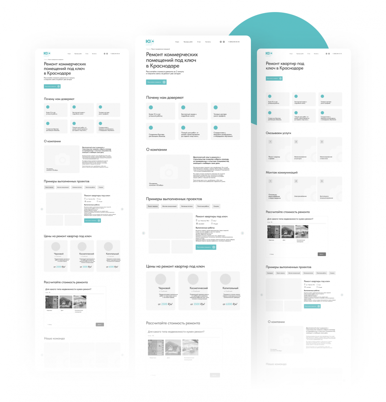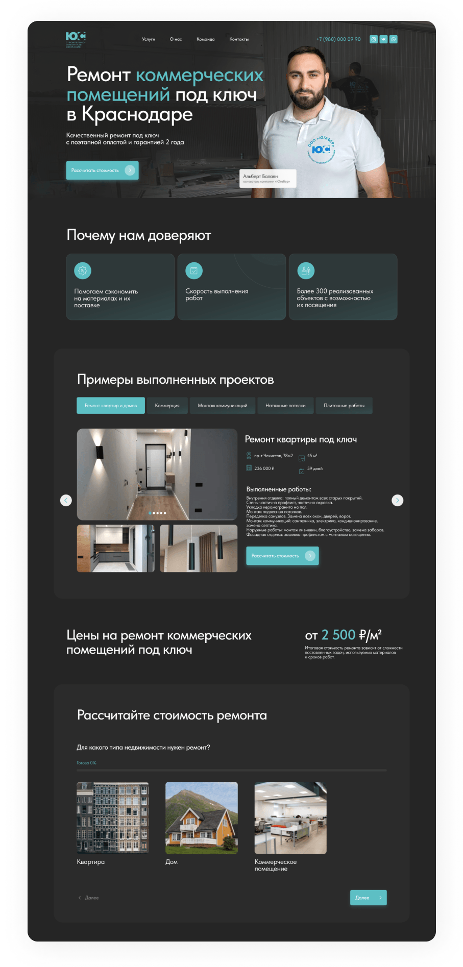 При разработке дизайна сайта мы уделили особое внимание функциональности и удобству использования. Удобная навигация по сайту позволяет быстро и легко ознакомиться с услугами, примерами выполненных работ, познакомиться с командой, связаться для консультации, а также рассчитать примерную стоимость ремонта.